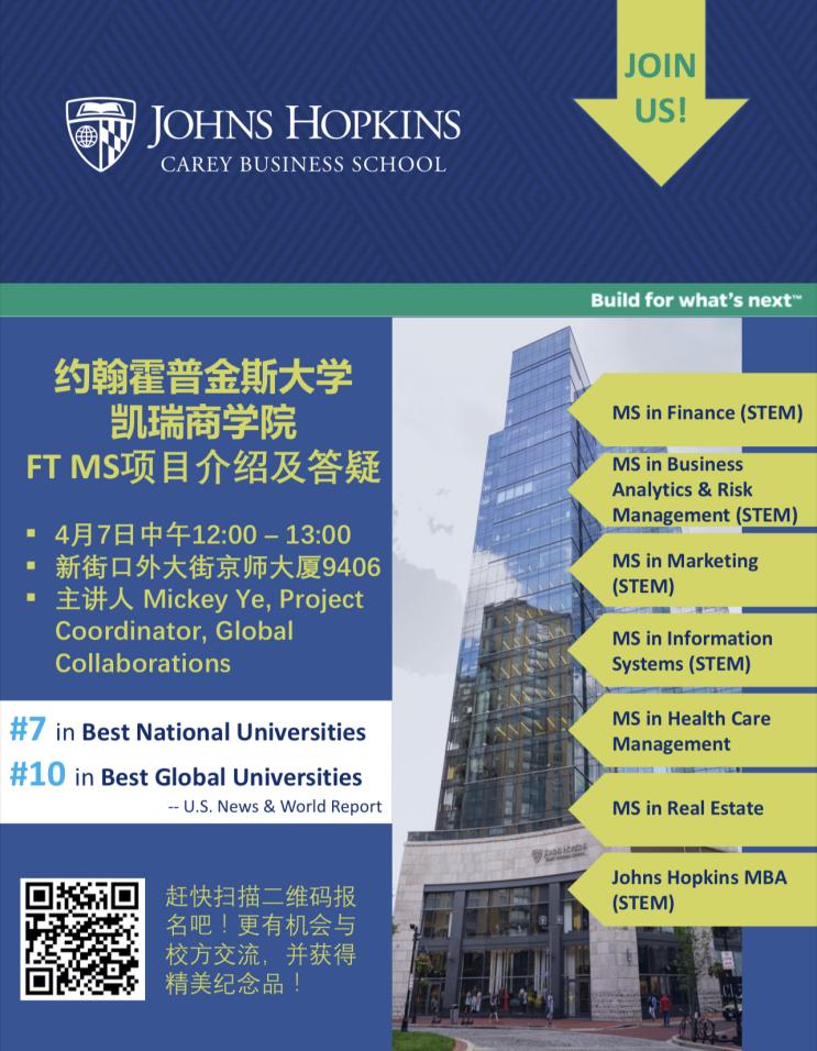 约翰霍普金斯大学凯瑞商学院(Johns Hopkins University, Carey Business School)将于2023年4月7日举行宣讲会,欢迎感兴趣的同学报名参加。