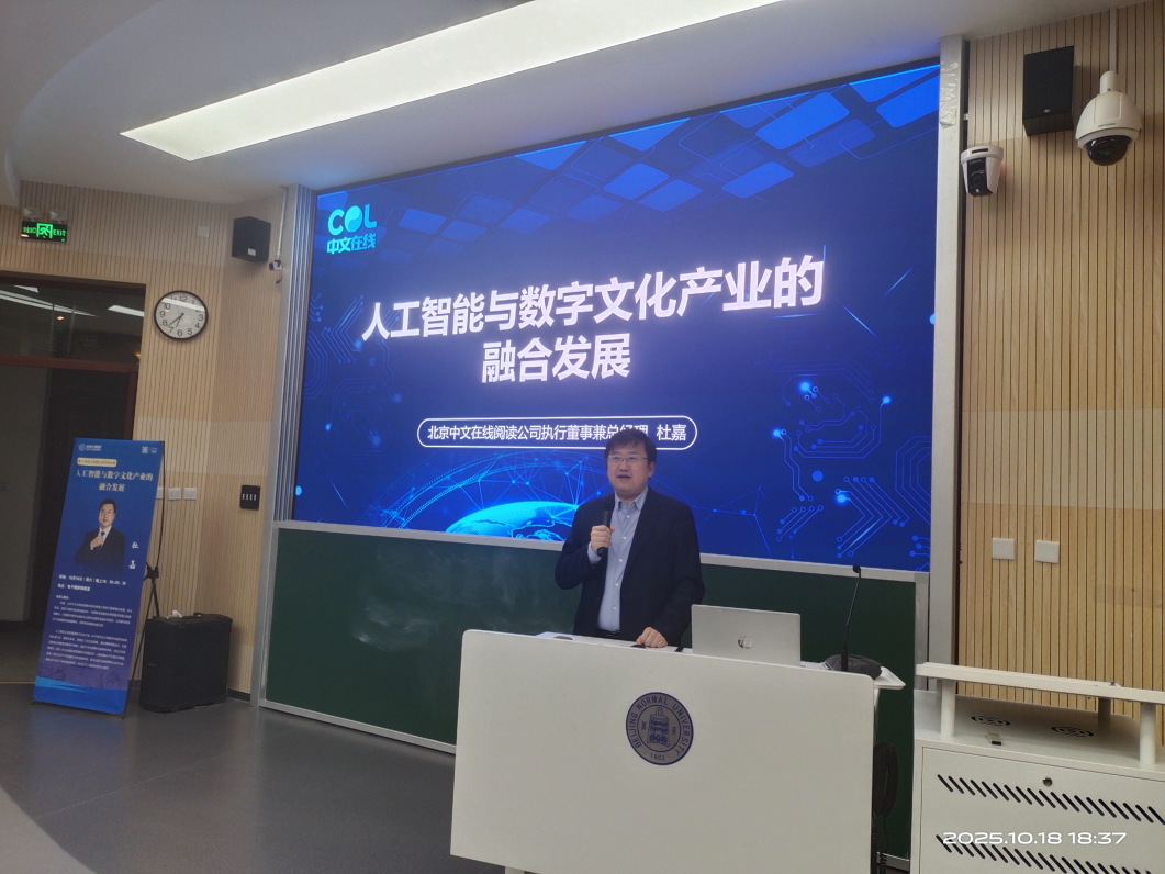 On the evening of October 18, 2025, the 48th lecture of the "Digital Economy and Management Lecture Hall" of BNUBS, titled "The Integration and Development of Artificial Intelligence and the Digital Cultural Industry", was held in the lecture hall of the Electronic Building. The lecture was specially invited by Du Jia, the executive director and general manager of Beijing Chinese Online Reading Education Technology Co., Ltd. to be the keynote speaker. Zhou Jianghua, the Director of the MBA Education Center, presided over the lecture, and more than 150 undergraduate, master's and doctoral students from the School attended.