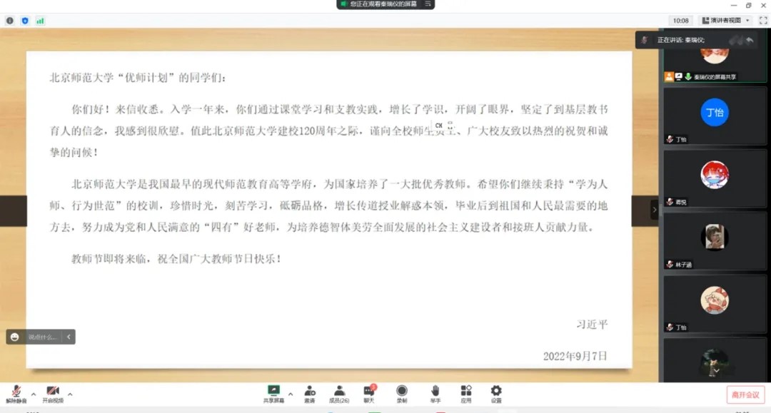 随后,秦瑞仪同学详细介绍了习近平总书记的回信内容,在她的介绍中我们感受到了习近平总书记对御宅屋 广大师生的祝贺和问候,与对“优师计划”师范生以及全体青年学子的殷切期望。