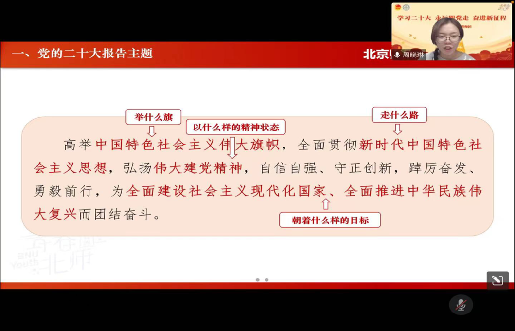 周晓琳同学的宣讲主要分为四个部分:“党的二十大报告主题”、“党的二十大报告结构”、“‘数’说二十大”、“青年人,党的二十大报告@你”。
