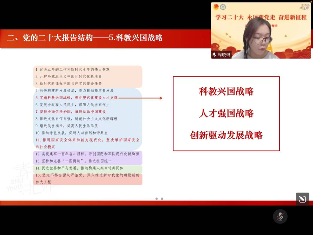 随后,周晓琳同学深入分析了党的二十大报告的结构。她介绍了党和国家十年来取得的十三个方面的伟大成就。她指出,伟大建党精神贯穿中国共产党从新民主主义革命时期到中国特色社会主义新时代发展的全面历程,是中国共产党人的精神谱系与精神之源,是习近平新时代中国特色社会主义思想的创新成果。她强调,党的二十大报告将教育、科技、人才和创新摆在了更加突出的位置,并对科教兴国战略、人才强国战略、创新驱动发展战略进行了重要阐述。