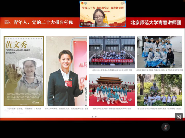 最后,周晓琳同学以“青年人,党的二十大报告@你”收尾,将党的二十大报告与党和国家对青年的希望联系起来,鼓舞同学们奋进向上,紧跟党的步伐。正如党的二十大报告指出的那样,“广大青年要坚定不移听党话、跟党走,怀抱梦想又脚踏实地,敢想敢为又善作善成,立志做有理想、敢担当、能吃苦、肯奋斗的新时代好青年,让青春在全面建设社会主义现代化国家的火热实践中绽放绚丽之花。”