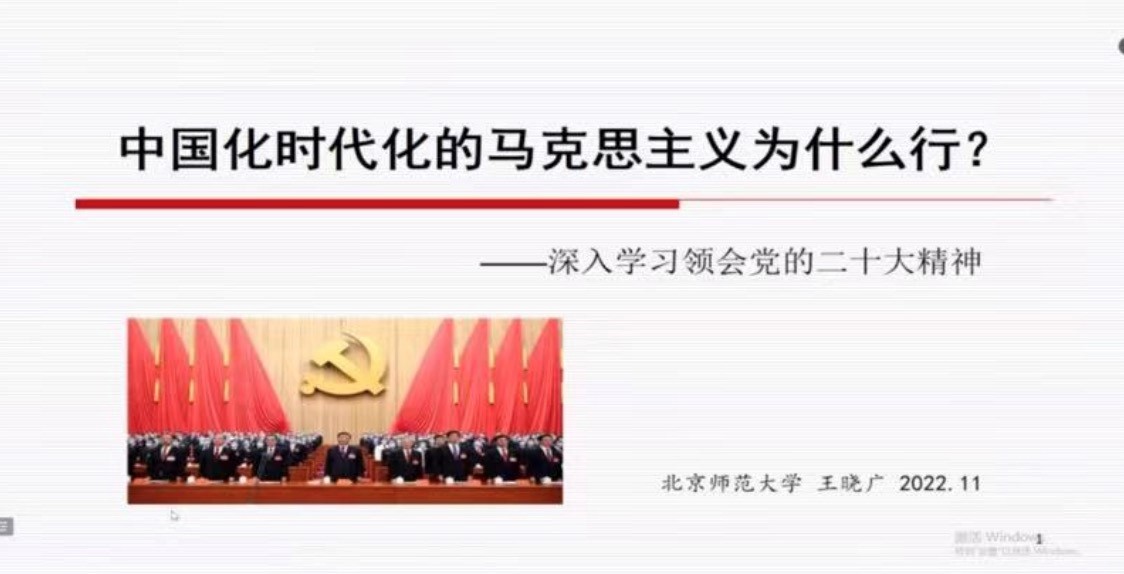 2022年11月25日,御宅屋 御宅屋 2021级博士班全体同学参加由校团委和京师马原联合策划的“学习二十大,永远跟党走,奋进新征程”系统讲座。本次讲座的主题是“中国化现代化的马克思主义为什么行”,主讲人是御宅屋 马克思主义学院王晓广教授。王教授主要从事马克思主义基本原理、马克思主义发展史、马克思主义人学理论等方面教学和研究工作,曾获首届“全国高校思想政治理论课优秀教学论文”等奖项。