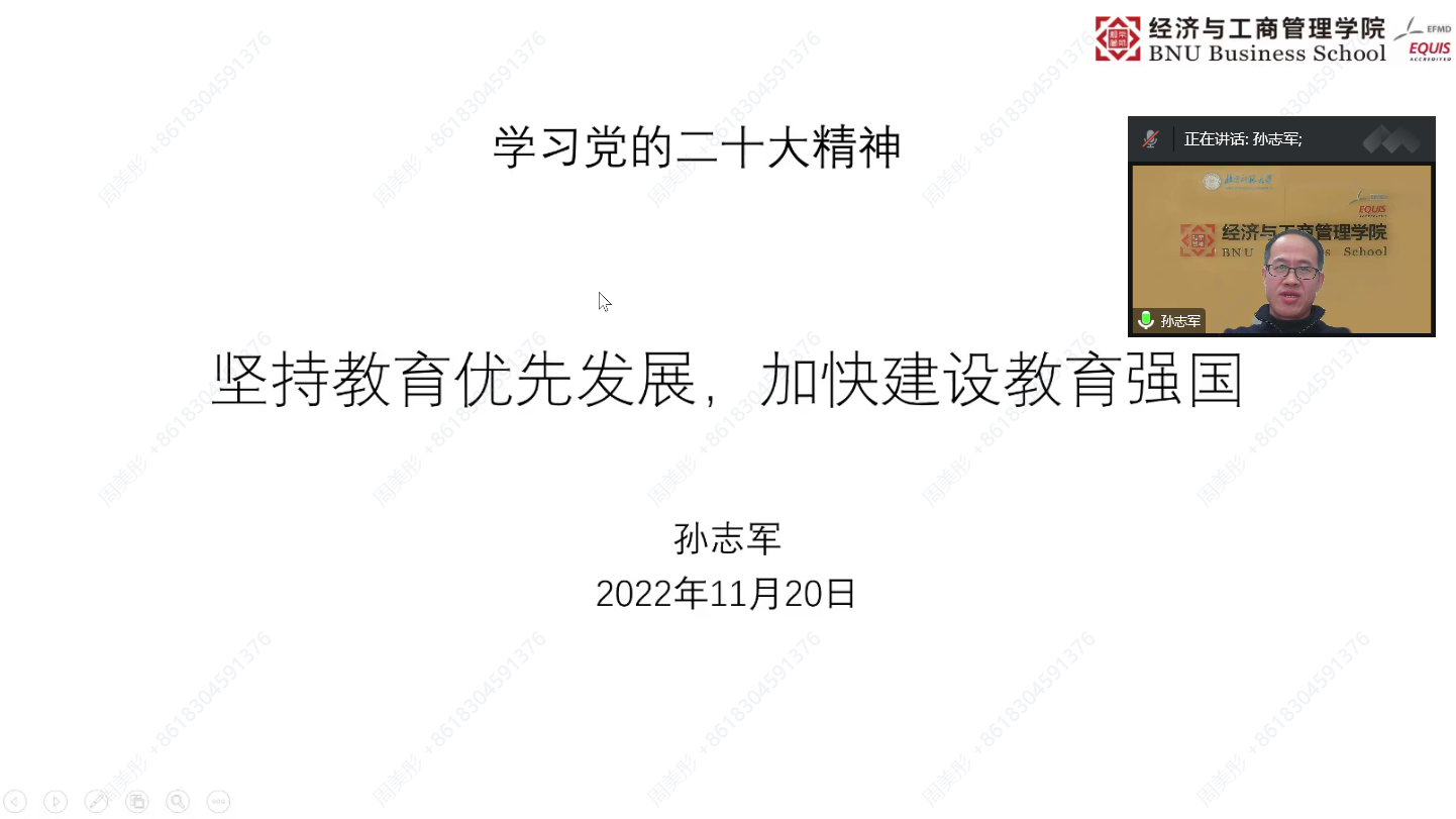 此次讲座加深了同学们对党的二十大精神的理解,使同学们充分认识到了坚持教育优先发展、加快建设教育强国的重要性和必要性。北师大经管人将时刻秉持“学为人师、行为世范”的校训精神,培育爱国情怀,修炼品德修养,丰富专业学识,努力成为德智体美劳全面发展的社会主义建设者和接班人。