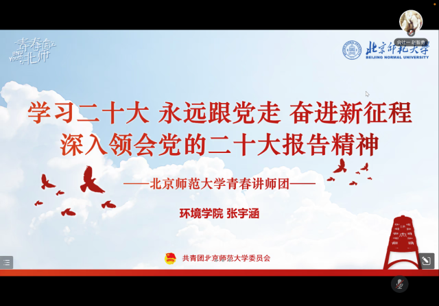 张宇涵同学首先介绍了党的二十大报告的产生过程和党的二十大报告的主题,强调了伟大建党精神;接着通过与党的十九大报告对比,分析了党的二十大报告结构,分享了“十个明确”、“十四个坚持”、“十三个方面成就”和“科教兴国战略”等重要内容;随后通过“1”、“2”、“3”、“5”四个数字 “数”说二十大,介绍了“一个中心任务”、“第一要务”、“第二个答案”、“归根到底是两个行”、“三个务必”、“三件大事”、“五项重大原则”、“五个必由之路”;最后播放了人民日报出品的关于党的二十大描绘的中国未来蓝图的视频,希望青年人在全面建设社会主义现代化国家的火热实践中绽放绚丽之花。宣讲中,张宇涵同学精心设计了知识问答环节,同学们在评论区争相抢答,学习氛围浓厚。