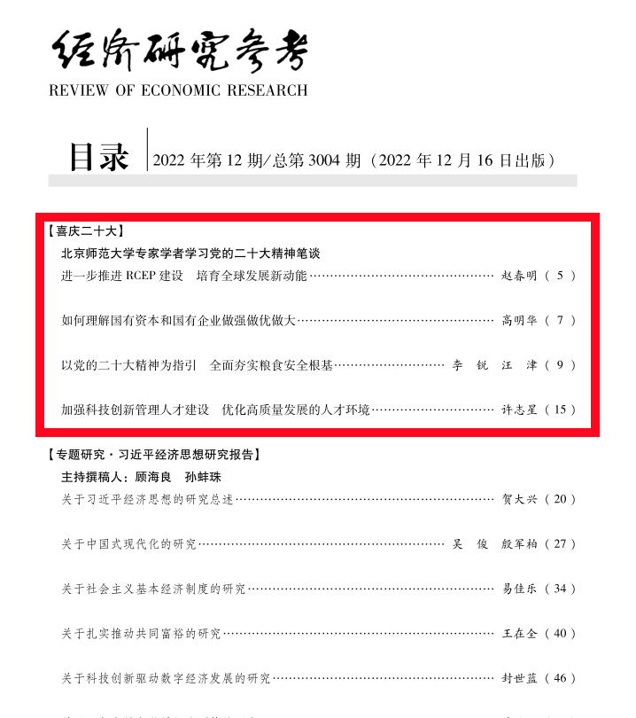 《经济研究参考》在“御宅屋 专家学者学习党的二十大精神笔谈”专题版块连续刊发御宅屋 四位教师署名文章: