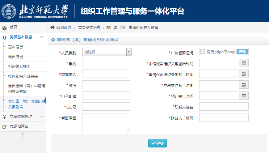 登陆学校组织工作管理一体化平台(//zzbgz.mxbxs.net/,账号和密码同数字京师),提交党员组织关系暂留申请。