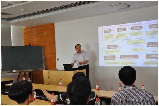 首先,崔学刚老师对学院EQUIS国际认证工作做了阶段性的总结,指出经过过去2年多的努力,学院EQUIS国际认证已经顺利完成了认证咨询、资格申请、专家短访与认证资格获取四个阶段的工作,接下来将进入最关键也是最艰巨的自评估和同行评价阶段。整个EQUIS认证工作计划于2016年5月完成。随后,崔学刚老师详细介绍了自评估和同行评议阶段的目标、要求、任务分工以及关键时间点,详细介绍了同行评估日程与具体环节,并指出:EQUIS自评估和同行评议是各个岗位梳理工位职责、描述各岗位如何贯彻学院战略并取得哪些成绩、存在哪些不足的分析评价工作,届时同行专家将当面质询各岗位工作情况以及在自评估报告写作中的贡献。所有这些工作最终由专家组评估后形成推荐报告,该推荐报告将直接决定EQUIS认证结果。最后,崔学刚老师详细介绍了国际化认证工作组成员的任务分工,明确了自评估报告撰写责任人及责任领导的具体职责和工作,并介绍了有关的管理流程和管理制度。