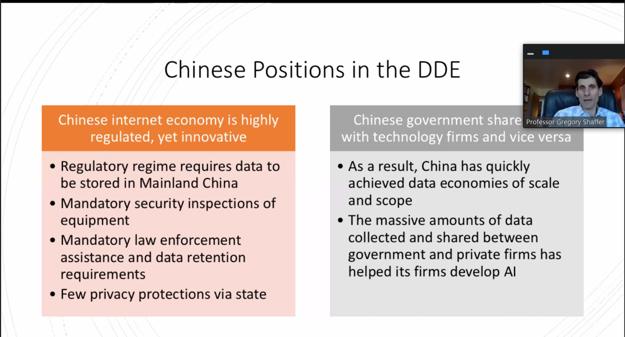 美国加州大学尔湾分校讲席教授Gregory Shaffer阐述了数字经济在法律语境下的挑战,尤其是货物和服务贸易的定义边界问题,以及各国对数据流动的法律规定不同等。对此,Shaffer教授介绍了WTO成员在规范数字贸易方面的工作以及各大经济体自身的努力。