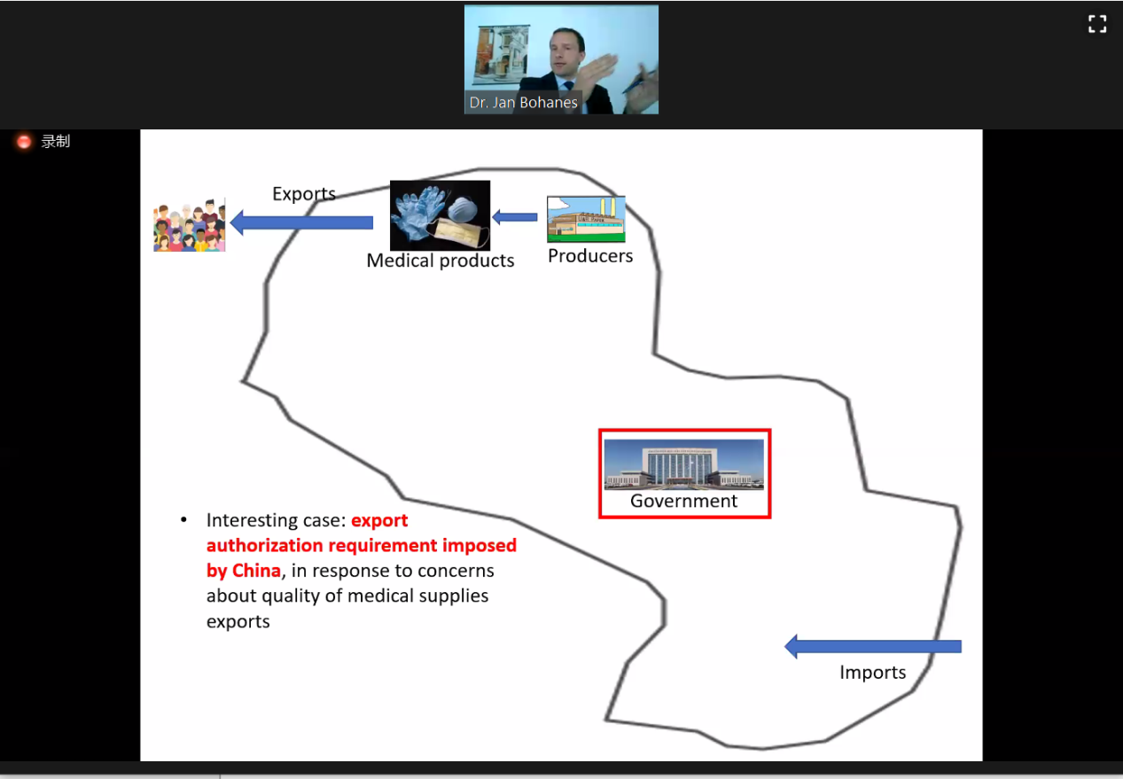 WTO法律咨询中心(ACWL)高级顾问Jan Bohanes博士讲解了新冠疫情爆发后各成员采取的一系列进出口干预和补贴措施以及WTO相关规则的适用。