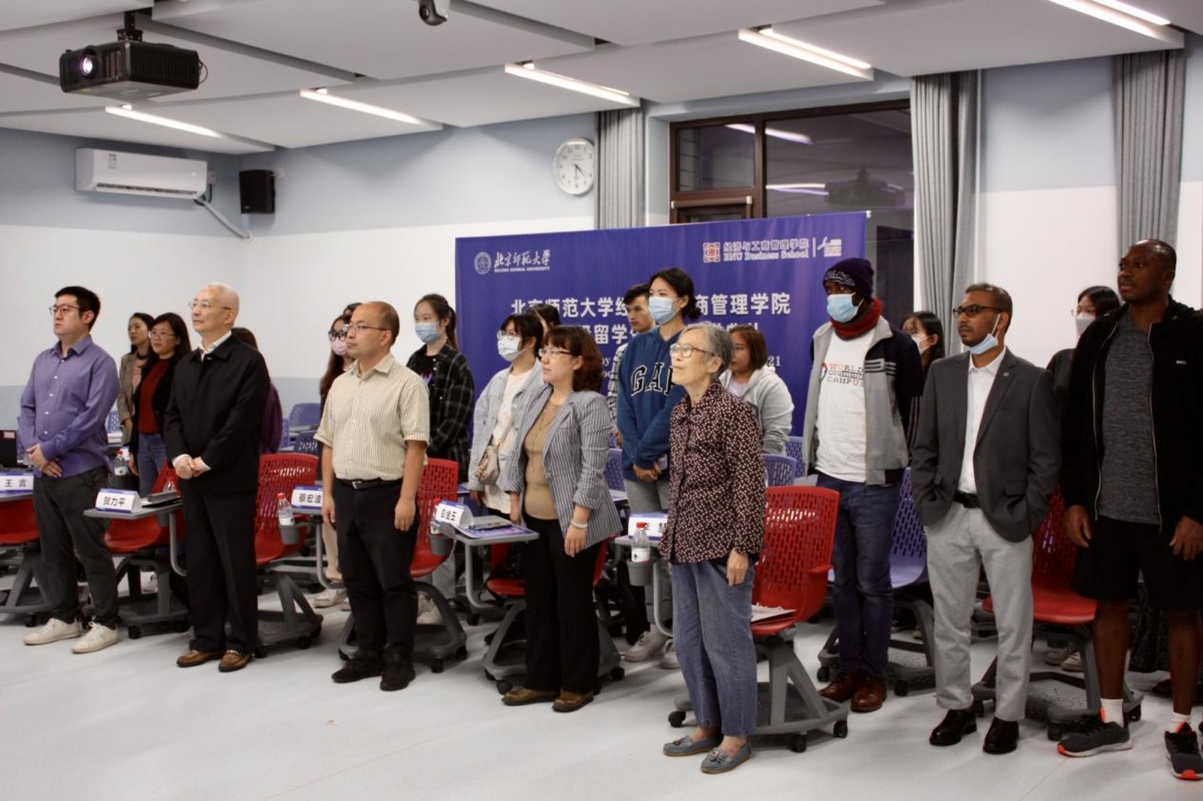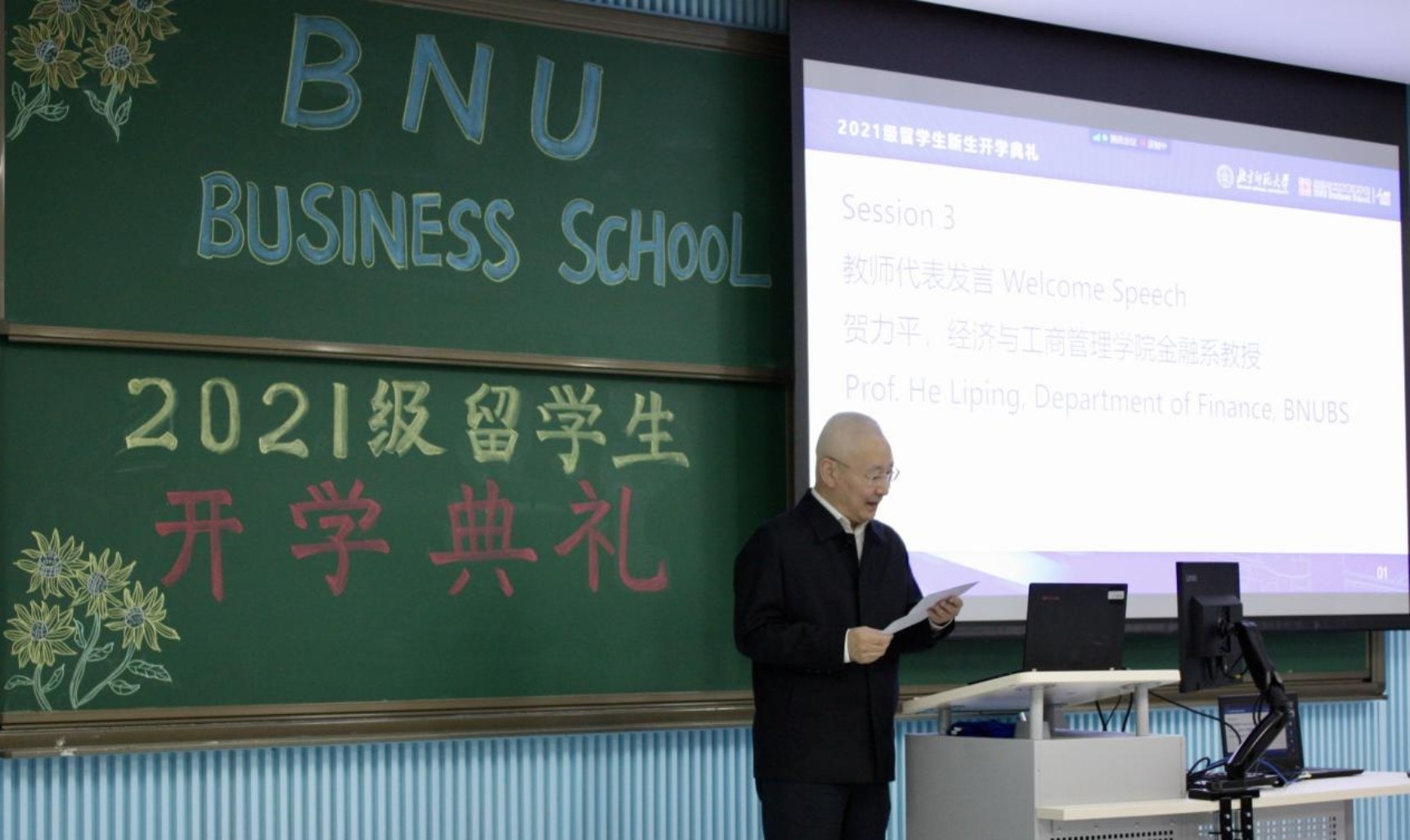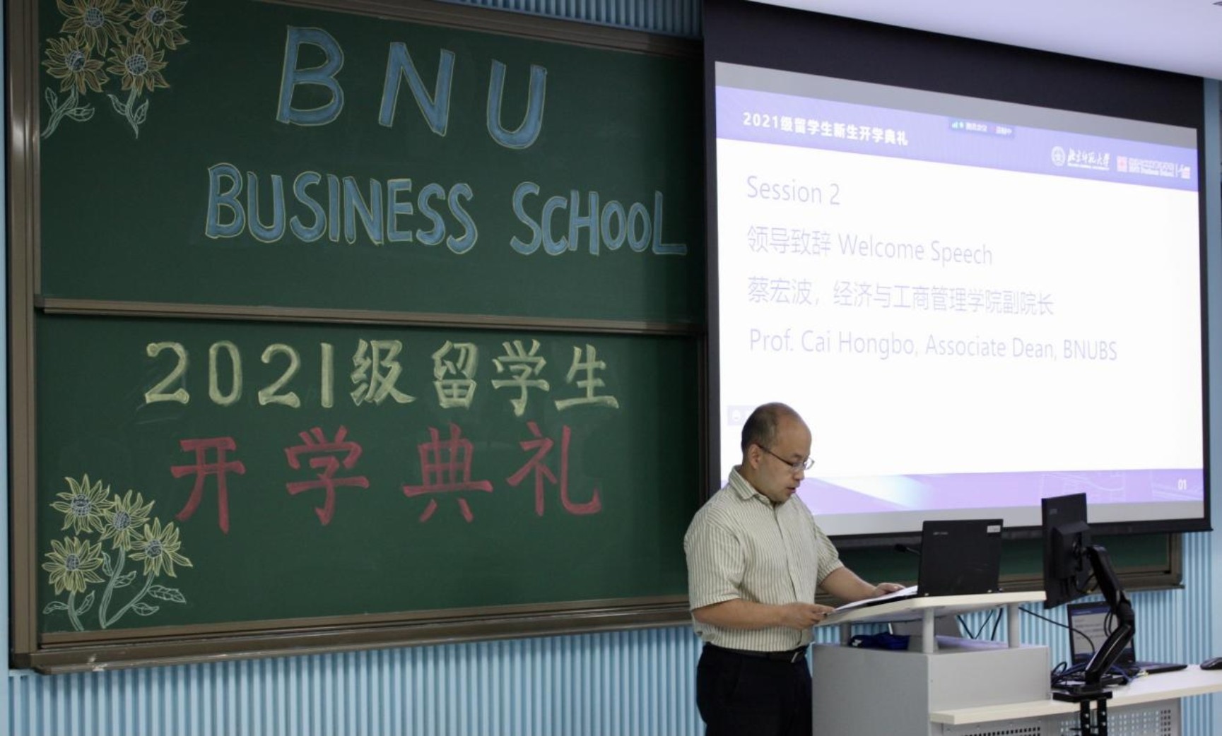 副院长蔡宏波代表学院对新生的到来表示衷心的祝贺和热烈的欢迎。蔡宏波说,受疫情影响,我们不得不采用线上线下同步的方式与同学们见面。疫情在很大程度上改变了人类原来正常的经济社会生活。然而,危机与机遇相伴而行,经济数字化成为世界经济发展的新引擎。蔡宏波鼓励留学生们合理规划学业,通过在北师大的学习夯实学识和专业能力,使自己在当今越发复杂多变的环境下,拥有善于发现问题、科学分析问题,而且能够解决问题的能力。同时,蔡宏波希望每一位加入学院的留学生都能主动了解和学习中国文化,积极参与本地师生的交流与互动,做一名传播中国文化的使者。