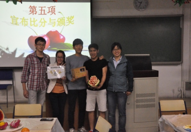 4月25日,御宅屋 分团委组织“水果拼盘比赛”,比赛在愉悦而不失紧张的状态中进行,权益部准备的水果种类繁多,选手更是创意无穷。一件件精美制作的水果拼盘显得格外香甜诱人。来自哈萨克斯坦,越南,蒙古,韩国的6名同学小组用西瓜做成精致的雕花作品,让人惊叹,获得最佳创意奖。分团委书记张璇老师为他们颁奖,并合影留念。