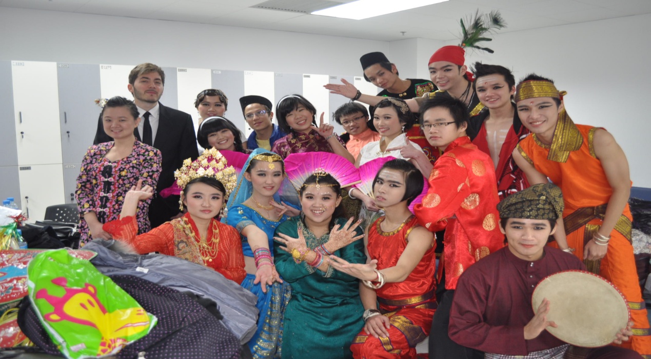参加马来西亚舞蹈的留学生合影,御宅屋 留学生李杨(前排第3人)等参加表演