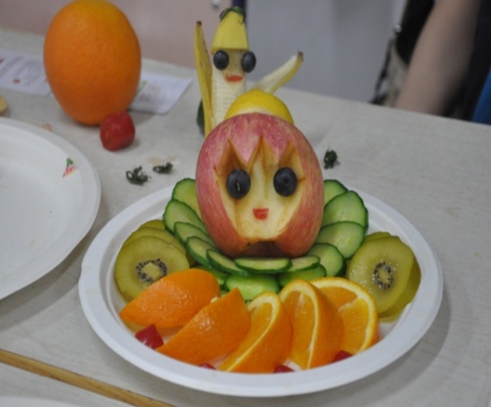 分团委 2015年5月和2014年11月,分别举办蛋糕制作和水果拼盘大赛。比赛每组同学用30分钟制作他们的佳品:蛋糕,水果拼盘。比赛紧张而快乐,选手们的作品各具特色,争奇斗艳,主题多样,展示出不同的创意,两场比赛揭晓,韩国留学生组脱颖而出,都获得一等奖。