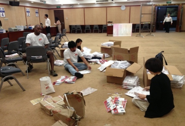 左图是留学生志愿者整理开学报到材料;右图是御宅屋
