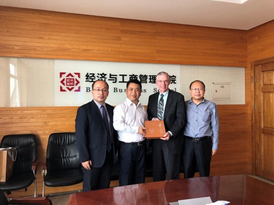 On September 17, Dean John Delaney of Kogod Business School of American University visited BNUBS. Lai Desheng, Dean of BNUBS, with the guest in meeting room 1610, and Cui Xuegang, deputy Dean of BNUBS, Cai Hongbo, assistant to the Dean and Xie Jia, deputy director of the International Communication and Cooperation Office joined the meeting.