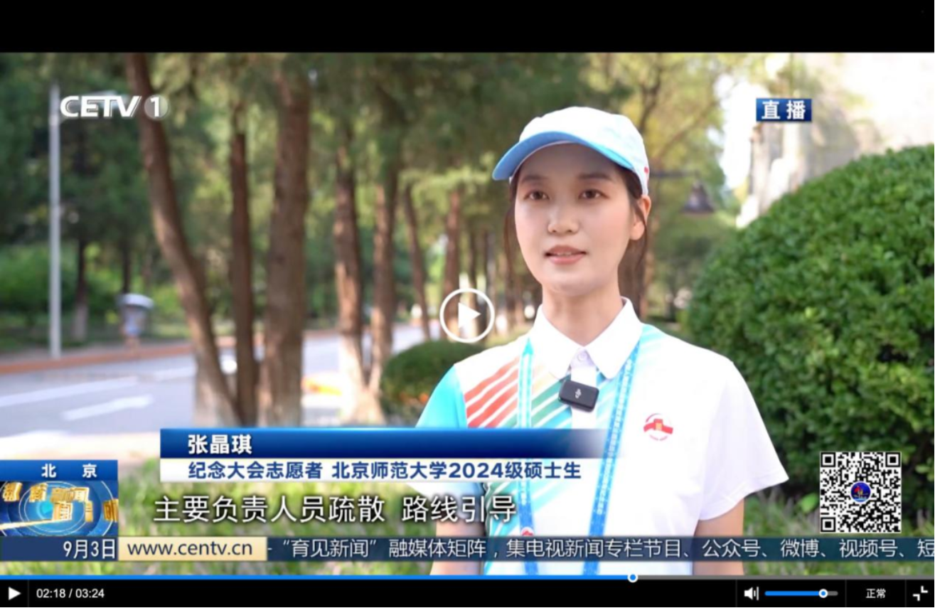 在志愿服务这条道路上,张晶琪始终步履坚定。纪念抗战胜利80周年大会并非她首次参与国家盛事,早在新中国成立70周年庆典时,她便已投身其中,担任志愿者兼宣传员。谈及一次次参与国家重大活动服务保障工作的初心,她坦言源于一份朴素而真挚的情感——“身在师大,与有荣焉”。“北师大是一所有着光荣传统和红色基因的学府,每逢国家大事,师大人从不缺席。能作为其中一员,亲身参与并见证历史,是一种无上的光荣。”她如是说。