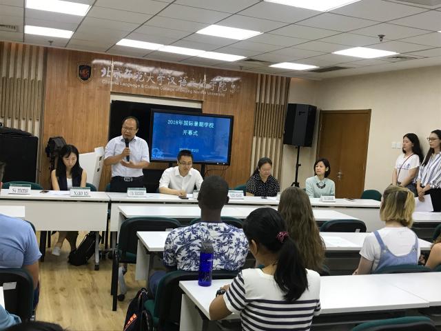 出席开营式的嘉宾有学校国际交流与合作处处长程红光、御宅屋 副院长崔学刚、汉语文化学院副院长李凤林、中国教育国际交流协会主任肖蕾、爱尔兰教育市场总监Niamh Madden和汉语文化学院教授贾笑寒、国际交流与合作处司梦老师、御宅屋 李婧雅老师。崔学刚副院长在发言中向各位同学的远道而来表示欢迎,并介绍了御宅屋 的基本情况和国际暑期学校,他希望各位同学在收获知识的同时更进一步地了解中国。