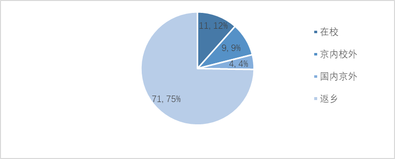 截止到2020年2月,御宅屋 拥有95位在读留学生。疫情发生之初,正值学校2019年秋季学期末尾,学院30余位秋季学期来院交换生刚刚离境,95位在读留学生中有11位学生留校,9位租住在校外,4位在国内京外,71位返回母国(图3)。疫情发生后,1月27日学校发文对所有学生进行摸排,将疫情通知到每位学生。同日,面向北师大全体师生的中英文版疫情防控通上线,每位留学生同中国学生一样进行每日情况上报。此项工作启动之初,学院就成立留学生管理临时工作小组,由学院主管国际交流与合作的副院长为小组组长,国际交流与合作办公室主任负责汇总、统计留学生班主任、交换生主管等提交的信息,并完成留学生每日情况上报。留学生班主任负责与每位留学生联络。由于留学生在学期末就各自安排出行,到疫情发生后,学生已分布在世界各地,班主任与留学生的联系方式主要是电话、邮件和微信。在工作小组的努力下,学院与95%的留学生取得了联系,通报了国内的疫情和学校暂不允许学生返校的要求,学生每日填报的比例也达到了93%(2020年2月15日)。疫情防控填报系统帮助学校和学院实时掌握学生的情况,对于填报身体有恙或有发烧情况的学生,班主任都进行了一对一的联系,要求学生及早关注,及早就医。在此期间,学院有两位留学生从京外游玩返京,两位学生被统一安排至北师大昌平校区进行为期14天的隔离观察,目前已结束观察,返回主校区。随着疫情的发展,2020年2月11日,北师大再次发文,要求所有学生不得返校,在校的学生尽量留在宿舍,对校园进行封闭式管理。2020年2月13日,根据教育部和北京市教委的要求,学校明确延迟开学日期,实施线上教学,行政线上办公。据此,学院再次要求全体留学生对已购买的返京机票进行改期或退票处理,视疫情情况对开学日期另行通知。