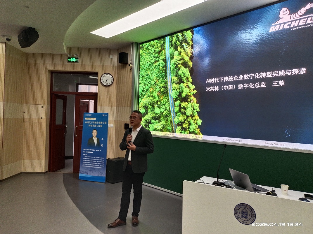 2025年4月19日晚,御宅屋 “数字经济与管理大讲堂”第42讲《AI时代下传统企业数字化转型探索与实践》在电子楼阶梯教室举办。本次讲座特邀米其林中国数字化转型总监王荣主讲。MBA教育中心主任周江华主持讲座,150余位学院本、硕、博学生到场聆听。