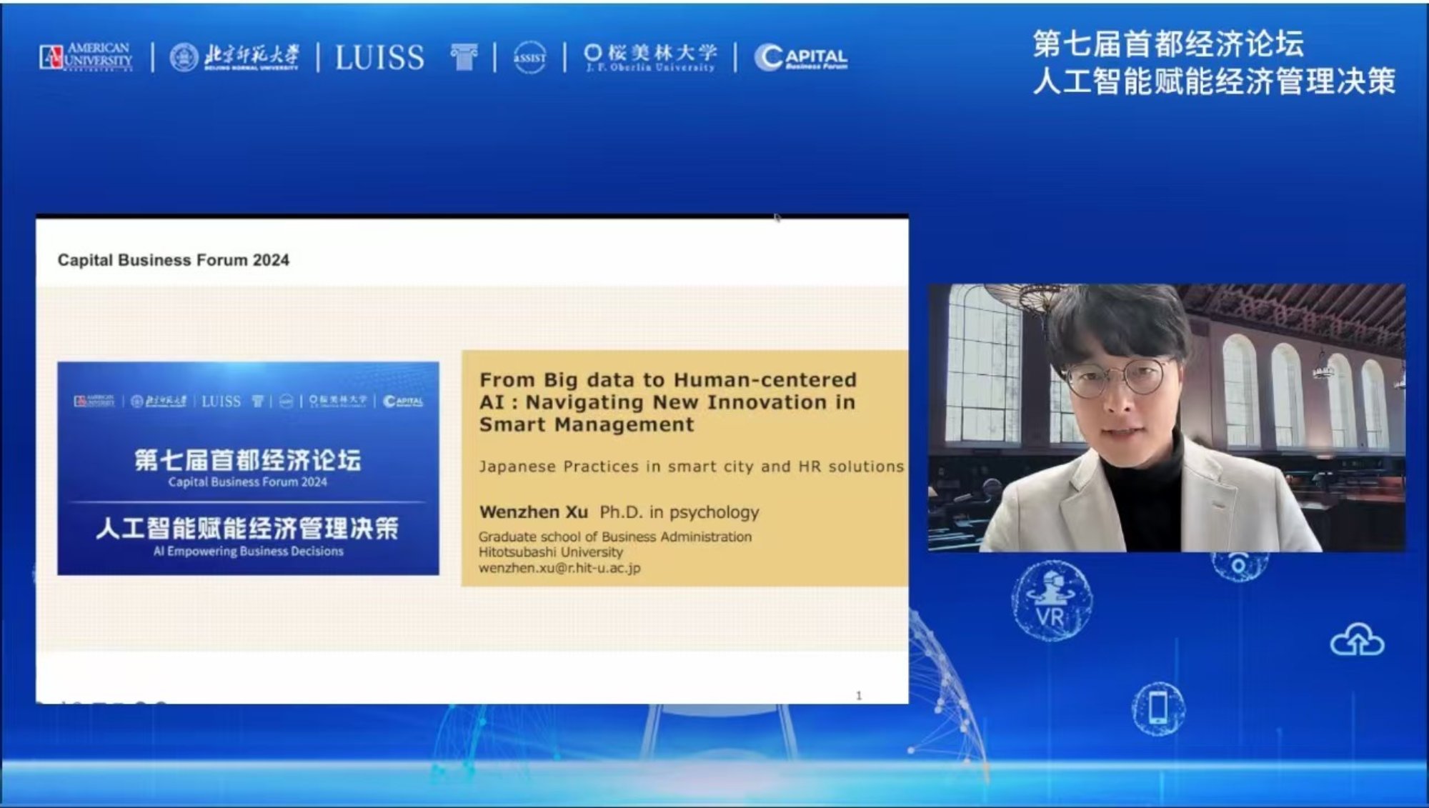 在平行论坛二会场,日本一桥大学徐文臻助理教授分享的题目是“From Big Data to Human-centered AI: Navigating Japanese Innovation in Smart City and HR Solutions”,他结合日本各大公司企业在人工智能赋能经济管理决策方面的具体实践,重点围绕“说服技术(Persuasive Technology)”在智能管理中的应用进行了介绍,并给出了该技术在未来可能的发展方向,以及说服性人工智能(Persuasive AI)在改变人的行为过程中可能产生一定的社会道德担忧。