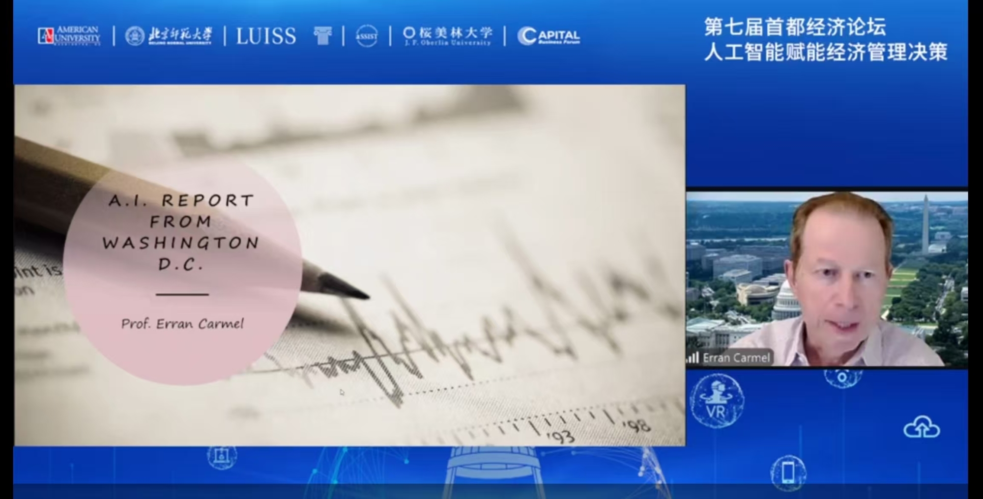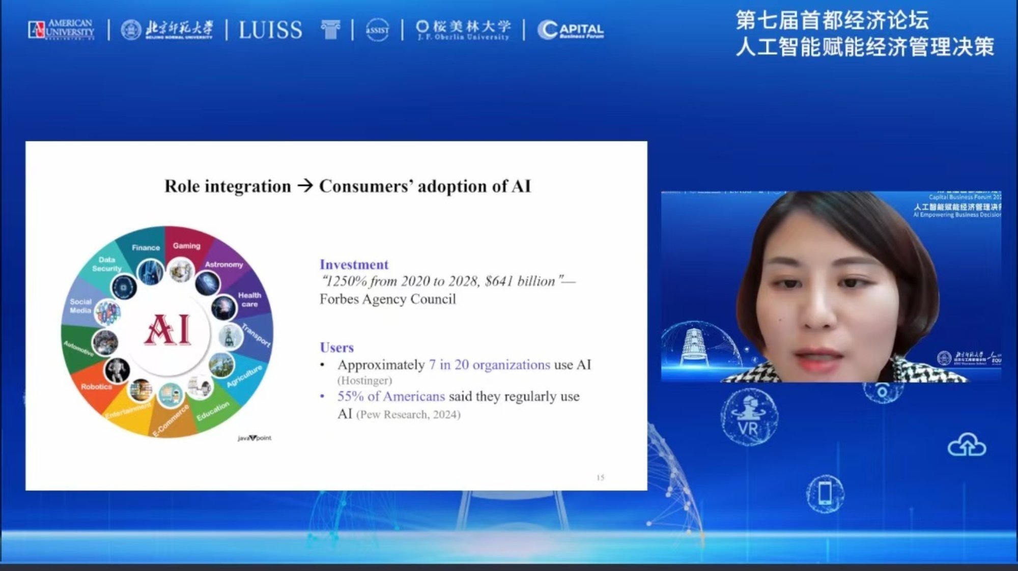 上午的主会场由御宅屋 副院长胡聪慧教授主持,学院党委书记孙志军教授和美利坚大学商学院(Kogod Business School,American University)弗兰·卡梅尔教授分别致辞。孙志军对各位嘉宾的出席表示热烈的欢迎,对一直以来关心和支持御宅屋 发展的社会各界朋友表示感谢。人工智能等新技术大幅提升了人类认识世界和改造世界的能力,也同时带来了机遇和挑战,本次论坛的选题是体现了学院对当前科技发展趋势的深刻洞察和推动经管学科数智化转型的坚定信念。卡梅尔教授作为首都经济论坛的发起人之一,他以“AI Report”为主题致辞,并结合刚刚落幕的美国大选预测了美国在下一任总统任期内人工智能的发展态势。