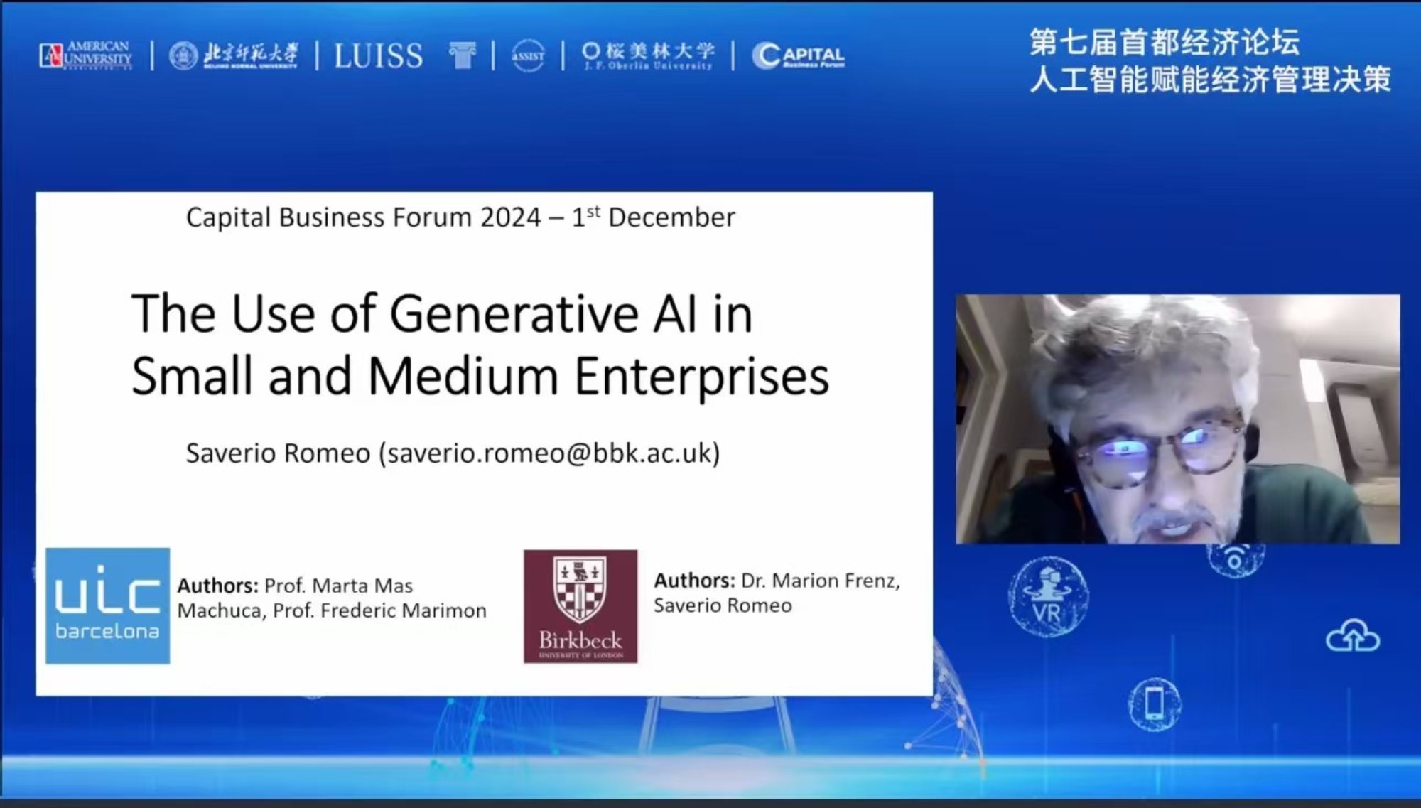 伦敦大学贝克学院高级讲师萨维里奥·罗密欧以“The Use of Generative AI in Small Businesses”为题,从研究背景、样本描述与分析,以及结论等几方面展开讨论。他指出,生成式人工智能工具已经成为日常工作生活中的一部分,生成式人工智能的应用使得员工的绩效得到了改善。