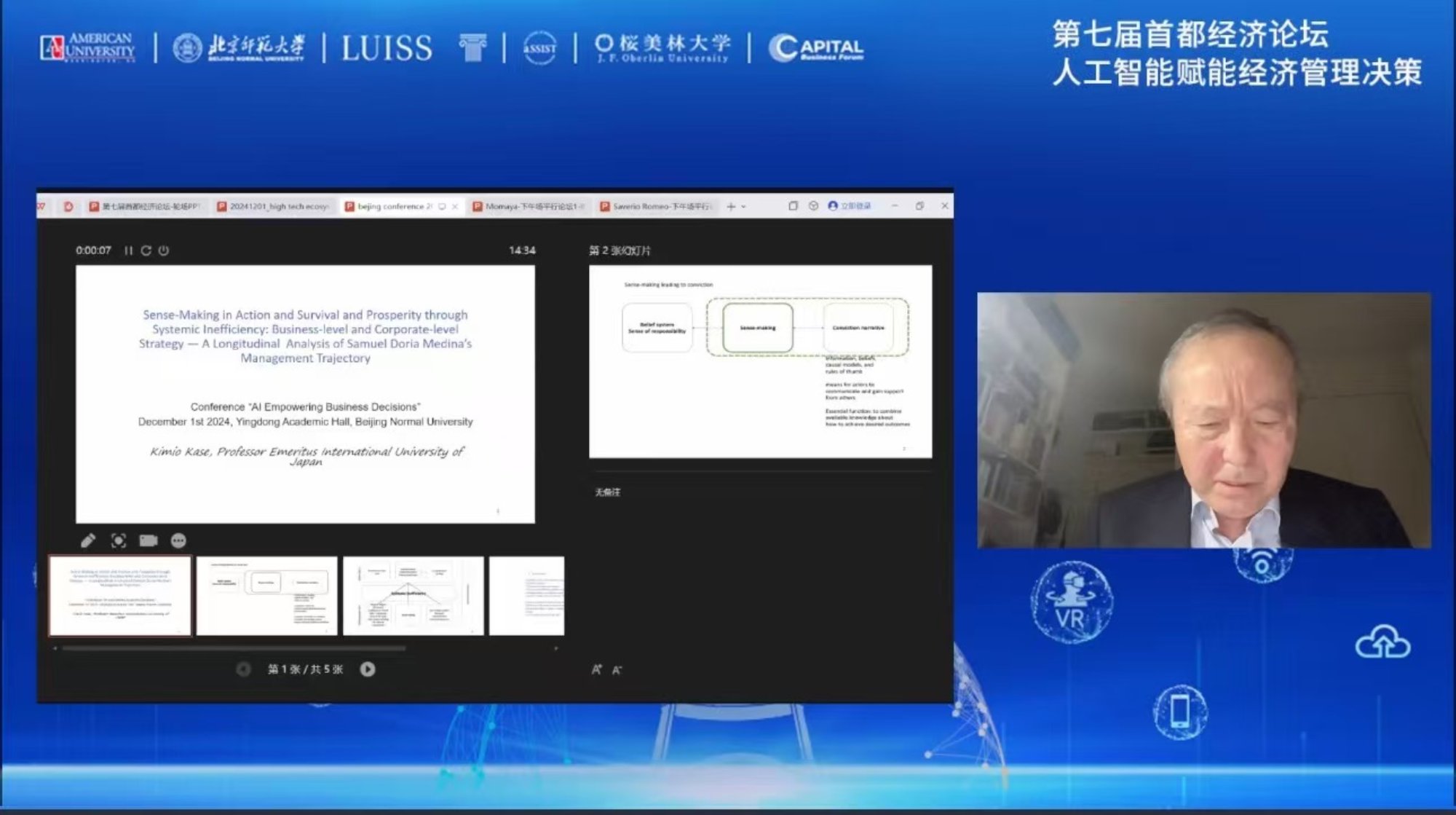 日本国际大学前校长、日本国际大学名誉教授加濑的演讲以“Sense-Making in Action and Survival and Prosperity through Systemic Inefficiency:Business-level and Corporate level Strategy — A Longitudinal Analysis of Samuel Doria Medina’s Management Trajectory”为题,结合Samuel Doria Medina管理轨迹的纵向分析,以小见大地给出了在复杂环境下进行商业与企业层面决策战略的启示。