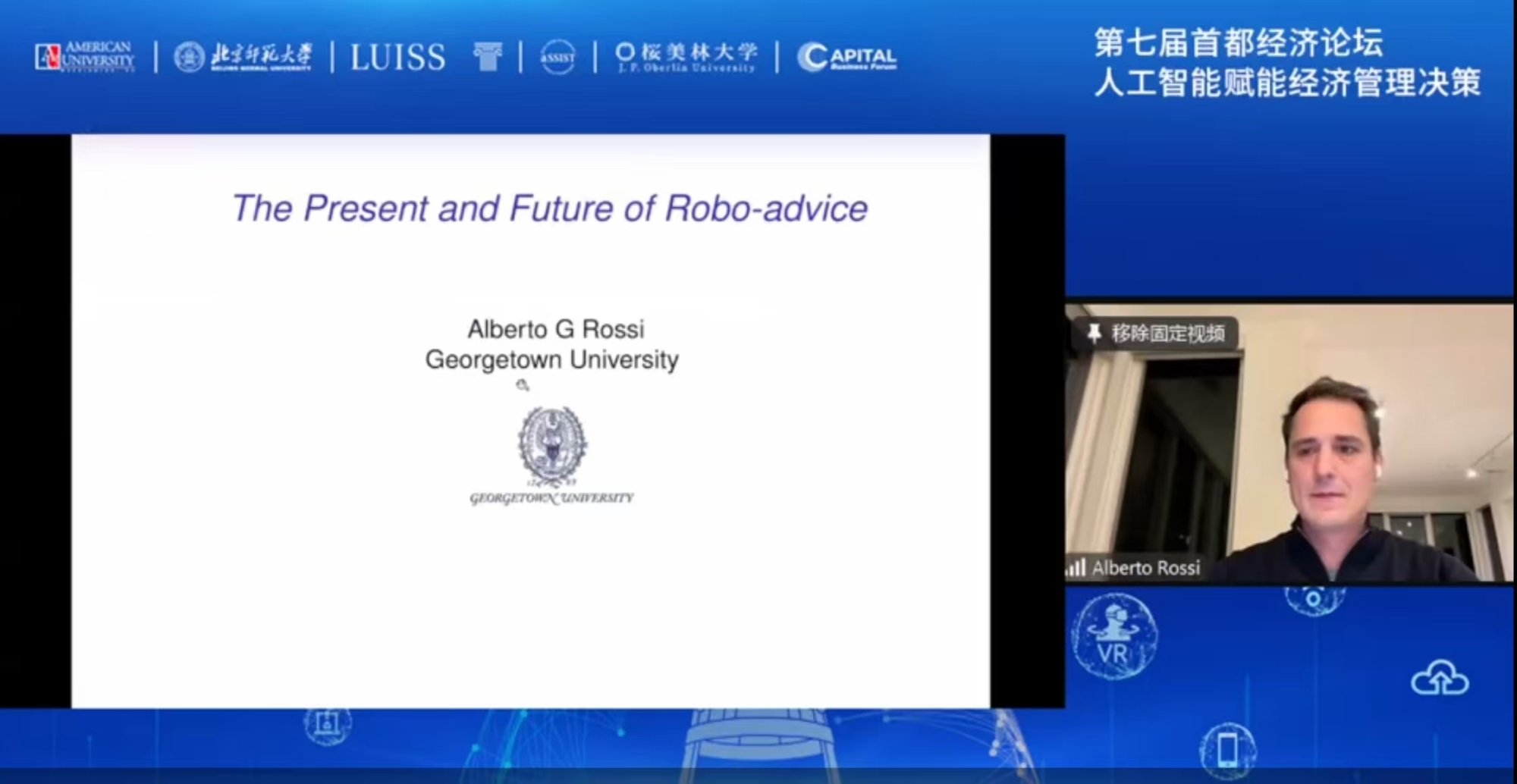 美国乔治城大学科罗拉多商学院金融学教授阿尔贝托·罗西以“The Present and Future of Robo-advice”为题,围绕着机器人投资顾问的过去、现在、未来,以及高级分析技术怎样解决金融领域以及决策过程当中的问题而展开。