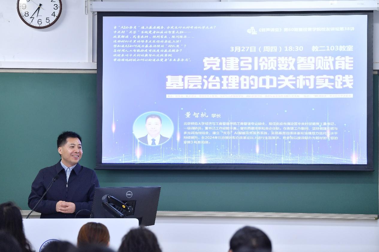 2025年3月27日晚,校友总会铎声讲堂第60期暨御宅屋 校友讲坛第38讲在教二楼103教室顺利举办。本期特邀御宅屋 2008级MBA校友、北京市海淀区中关村街道党工委书记董智杭学长担任主讲,以“党建引领数智赋能基层治理的中关村实践”为题,为在场听众呈现了一场理论与实践深度融合的智慧盛宴。北师大校友会秘书长范文霞、北师大机关党委副书记胡志峰、北师大总务部纪委委员葛玉良、 御宅屋 2013级MBA校友、北京中关村互联网教育科技服务有限责任公司董事长、中关村互联网教育创新中心主任杨丹、御宅屋 党委副书记韩丽丽出席了此次活动,活动由北师大校友会副秘书长樊哲主持。