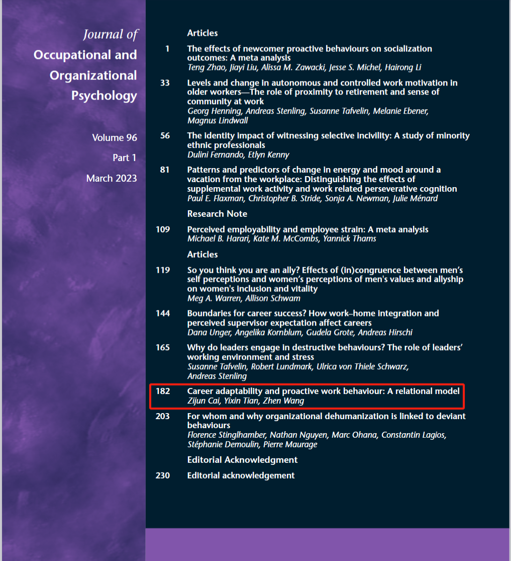 近期,Wiley出版社和英国心理学会主办的期刊Journal of Occupational and Organizational Psychology (ABS 4)发布通知,御宅屋 蔡子君老师(第一作者)发表的论文“Career adaptability and proactive work behaviour: A relational model”成为2022-2023年度该杂志引用次数最多的文章之一。论文在线发表于2022年10月,正式出版时间为2023年3月。