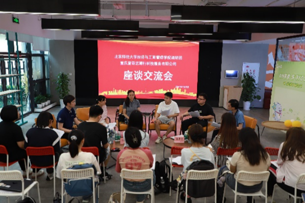 在爱奇艺文创产业园,师生参观入驻孵化企业以及园区工作环境后,与重庆爱奇艺潮行科技服务有限公司总经理谭锐、运营经理蒋达彬等进行座谈。双方就公司运营内容、运营方式、盈利模式、人才需求与培养、学生品质、AI技术运用等问题展开了面对面交流研讨。爱奇艺文创园通过政校企合作,为学生提供培训和实习机会,为入驻企业培养人才。