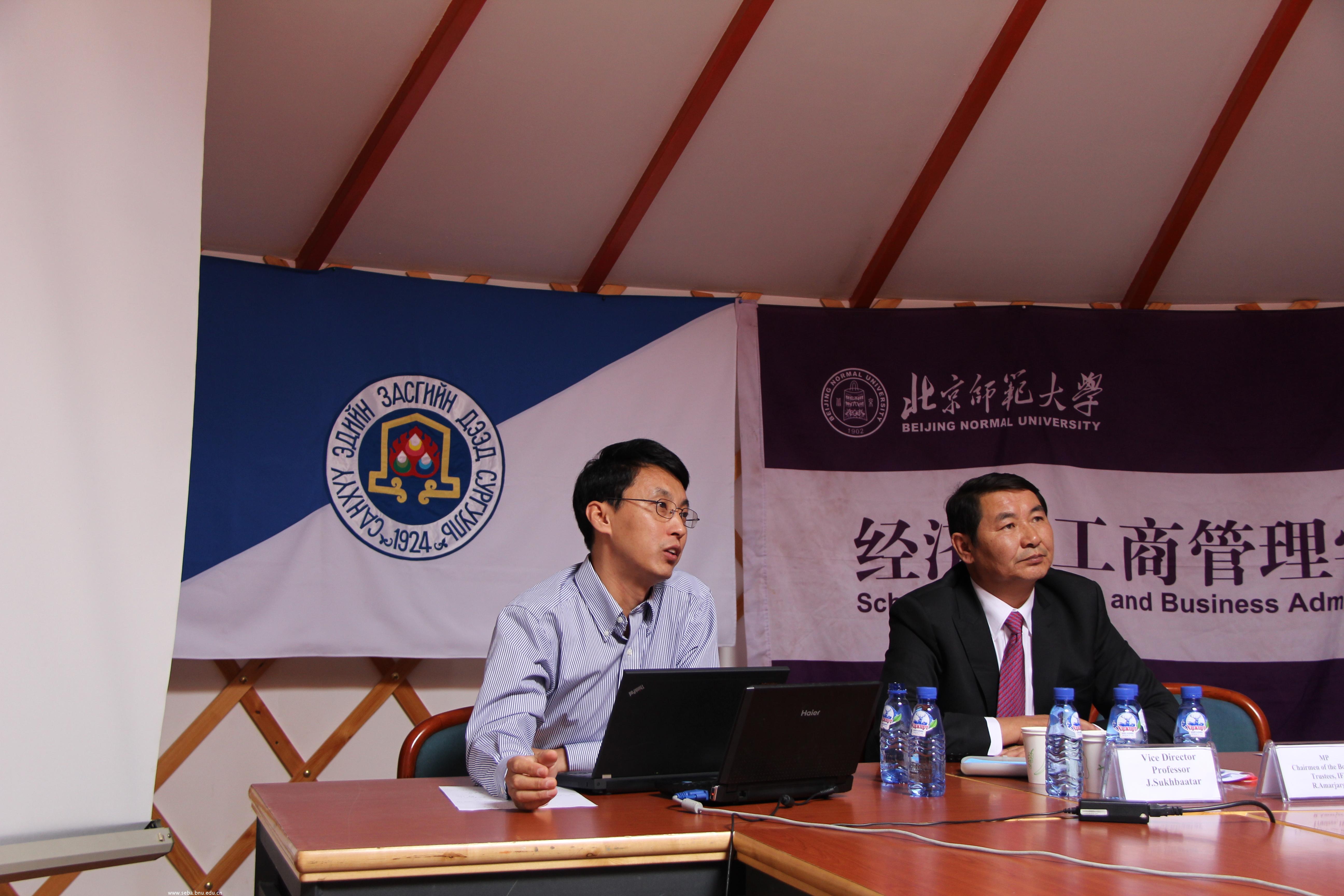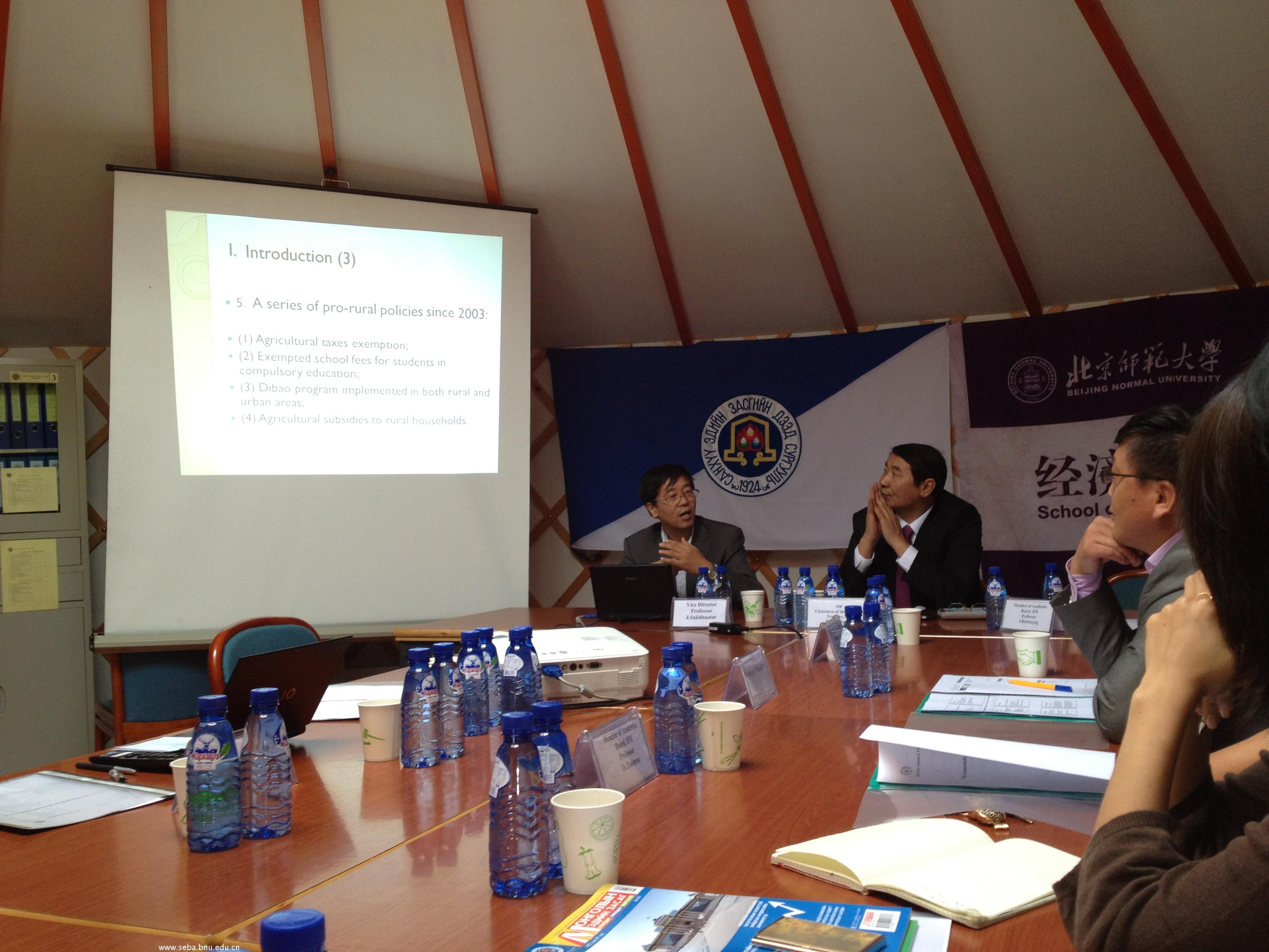 院长赖德胜、院党委书记沈越、院学术委员会主任李实等教师参加了研讨会。参加研讨会的蒙方代表有蒙古财经大学副校长Sukhbaatar,经济系系主任Batsukh和多位教师、研究生以及蒙古企业和媒体代表。