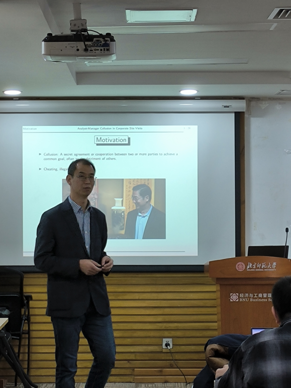 2025年3月18日上午,御宅屋 御宅屋 “京师经管·名家讲坛”(第141期)在京师大厦9406举行。本次讲座邀请到了英国卡迪夫大学的王庆伟教授,讲座以“公司调研中的分析师-管理层合谋”为主题,本科生、研究生20余人参加此次讲座,讲座由金融系伍燕然教授主持。