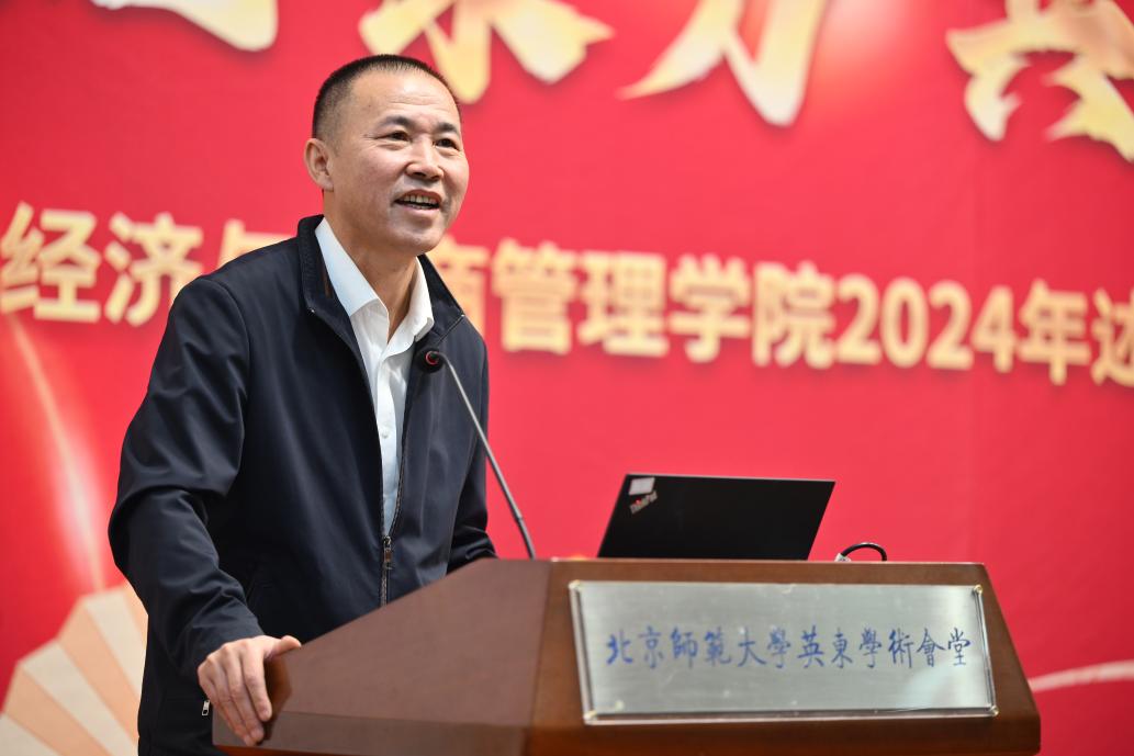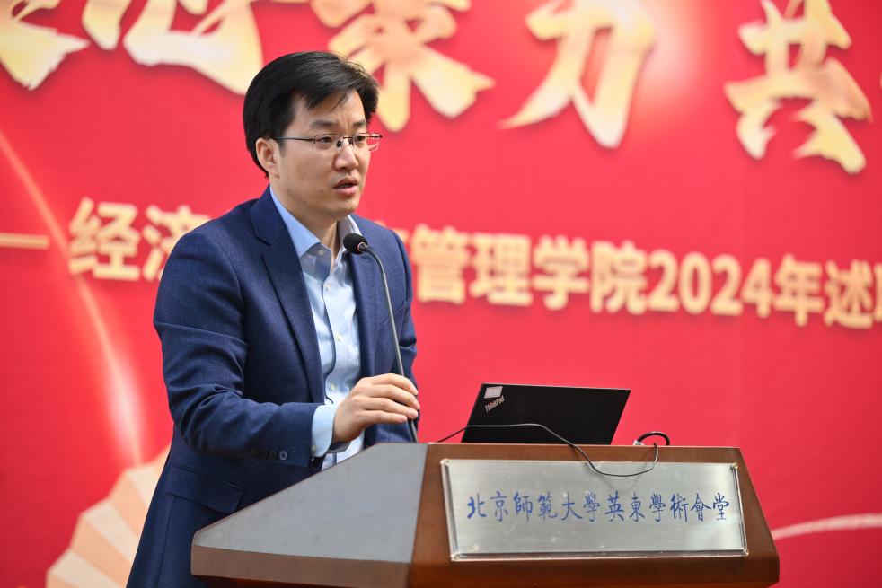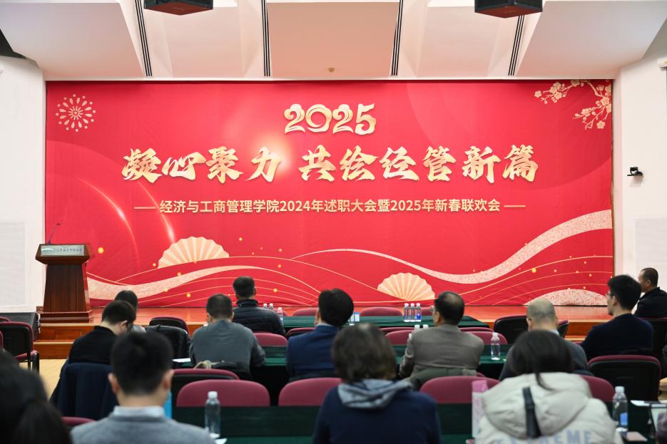 最后,戚聿东院长对2024年行政工作进行了全面总结。政治思想上,学院坚持立德树人,始终与党中央保持高度一致,努力贯彻落实学校十四次党代会精神;重大事件上,配合学校完成经济与资源管理研究院调整工作;学科建设上,明确二级学科发展思路,组建政治经济学系,推动产教学研合作平台搭建,完成教育部学位中心案例入库;在内部控制上,出台、修订多项院内管理制度,制度治院的机制更加完善。戚聿东也指出过去一年工作中存在的不足之处,强调将重点推进学科专业内涵建设、人才培养质量提升、科研、师资队伍建设等方面工作,号召全体教师在2025年更加努力工作推动学院发展再上新台阶。