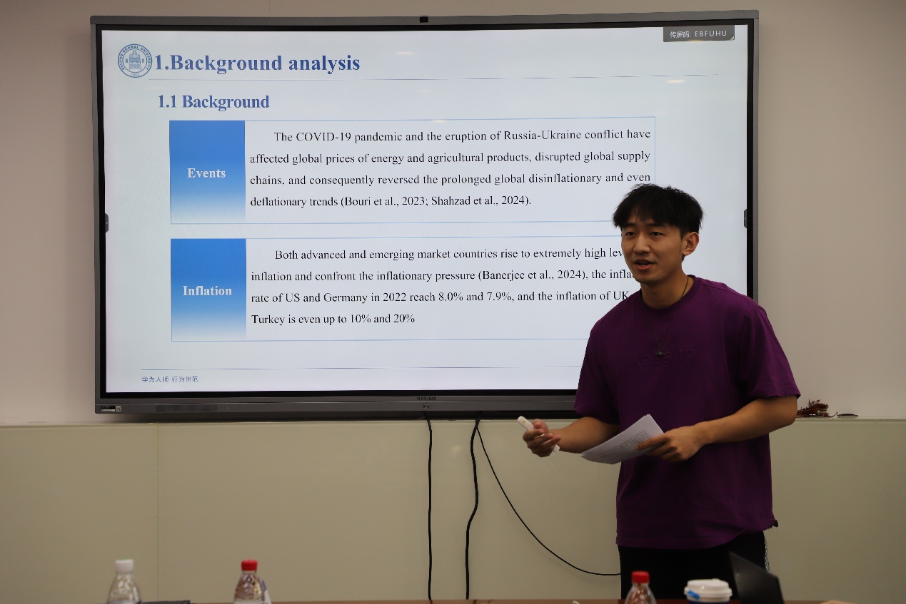 在论文发表环节中,程正涛同学首先带来了题为《Dynamic connectedness and spillover of inflation risk across the world》的研究,他的论文探讨了全球通胀风险的动态关联与溢出效应。徐嫄老师建议他改进PPT的呈现方式,并详细解释方法论部分,以增强研究的可理解性。李亚男老师则指出数据使用时间跨度较短的问题,并建议尝试使用月度数据。余嘉杰老师强调了研究稳健性的重要性,并鼓励他尝试其他机器学习方法进行比较。