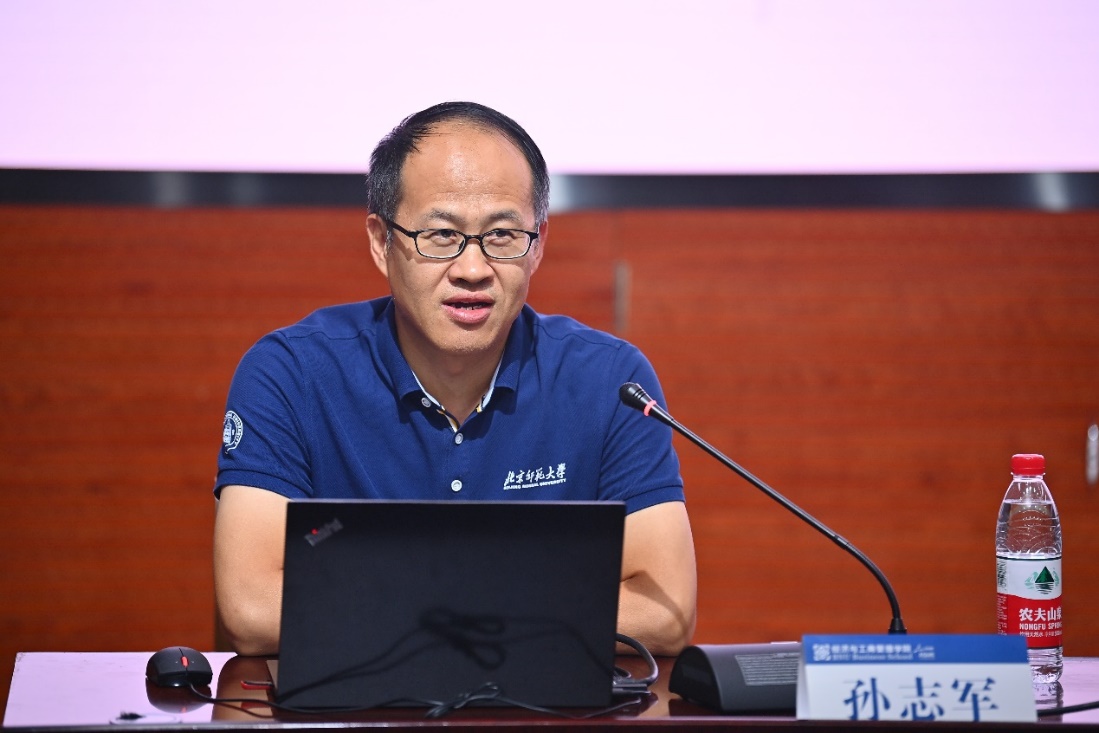 学院党委书记孙志军向新生讲授了开学“第一课”——院史院情教育。孙老师首先带领大家回望了学院四十余年来的光辉足迹,指出学院机构与学科变革发展深深嵌入我国经济社会体制改革的广阔背景中。随后,孙老师详细介绍了学院构建的各层次、多类型的人才培养体系,高水平、国际化、多元化的教师队伍及学院的高水平科研成果;并强调了学院致力于通过价值塑造、知识传授、能力培养维度,培养具有深厚的人文与科学素养、开阔的国际视野、强烈的社会责任感和“四有”素养人才的育人理念,并从就业去向、国际化交流等方面详细介绍了与理念相应的各项实际举措。最后,孙老师结合学院的使命、愿景、价值观阐释了学院文化和精神气质,鼓励新生作应将个人理想与国家命运紧密相连,争做“国之大者、为国为民”的新时代经管人。