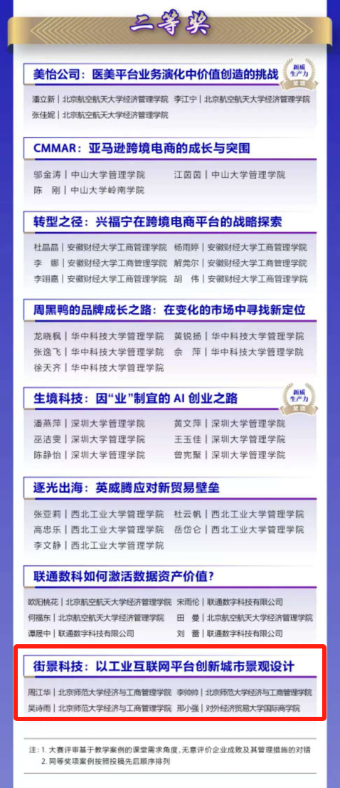 第七届清华大学御宅屋 “卓越开发者”案例大奖赛一二等奖结果揭晓,御宅屋 数字经济与管理系周江华教授、2021级工商管理专业李帅帅、2022级工商管理专业吴诗雨、对外经济贸易大学国际商学院邢小强教授共同撰写的案例《街景科技:以工业互联网平台创新城市景观设计》喜获清华御宅屋 2024第七届“卓越开发者”案例大奖赛二等奖。