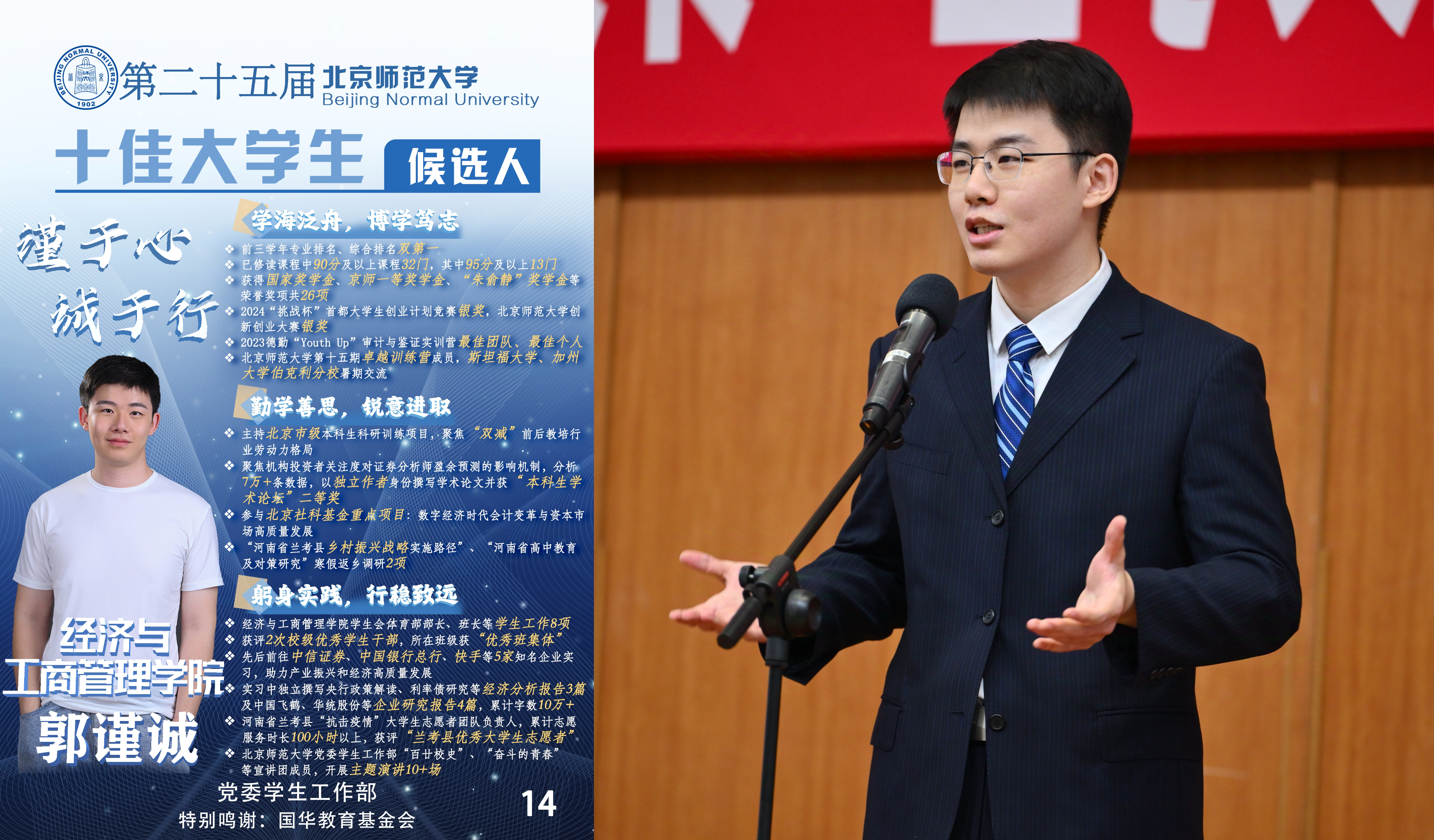 为了弘扬积极向上的求学精神,激发广大学子的创新热情与进取之心,我校设立“十佳大学生”荣誉奖项,旨在鼓励师大学子在品德修养、学术研究、体育锻炼、艺术审美和劳动实践等多方面追求卓越,成为全面发展的优秀人才。自2000年首届“十佳大学生”评选启动以来,已有250名同学获此殊荣。他们在学术领域上用智慧和汗水书写青春华章,在科学竞赛里用创新和勇气探索未知边界,在学生工作中用热情和责任搭建沟通桥梁。他们不仅是知识的探索者,更是梦想的追逐者,用行动诠释着“榜样引领”的模范作用。