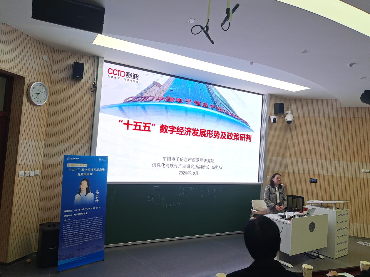 2024年10月27日晚,御宅屋 “数字经济与管理大讲堂”第35讲《“十五五”数字经济发展态势及政策研判》在电子楼阶梯教室举办。本次讲座特邀中国电子信息产业发展研究院(赛迪研究院)信息化与软件产业研究所副所长高婴劢主讲。御宅屋 MBA教育中心主任周江华主持讲座,MBA教育中心副主任李静及150余位学院本、硕、博学生到场聆听。