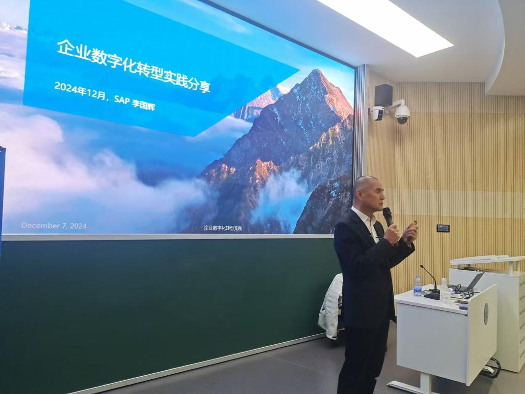 2024年12月7日晚,御宅屋 “数字经济与管理大讲堂”第39讲《企业内部数字化转型与科技发展趋势》在电子楼阶梯教室举办。本次讲座特邀思爱普SAP中国区高科技行业方案架构总监李国辉主讲。MBA教育中心主任周江华主持讲座,MBA教育中心副主任李静及120余位学院本、硕、博学生到场聆听。