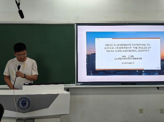 博士生王为凤的汇报主题为“From Subordinate Expertise to Ethical Leadership: The Roles of Work Hope and Moral Identity”,深入探讨了下属的专业能力如何通过工作希望与道德身份的中介作用,影响领导者的道德领导行为。