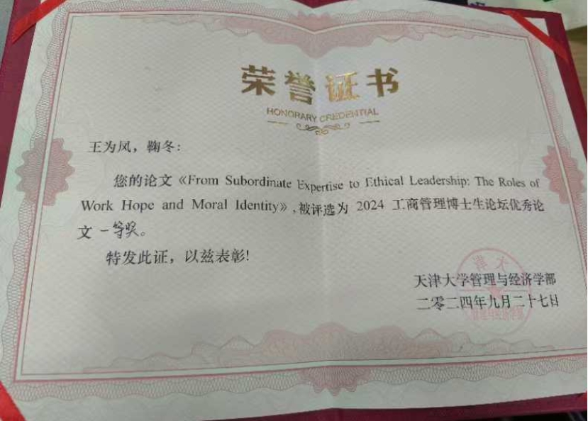 在此次学术论坛上,博士生王为凤以论文“From Subordinate Expertise to Ethical Leadership: The Roles of Work Hope and Moral Identity”荣获2024工商管理博士生论坛优秀论文一等奖。该研究因其创新性和理论深度得到了评审专家的一致认可,不仅拓展了道德领导的理论框架,还在实践层面提供了指导意义。