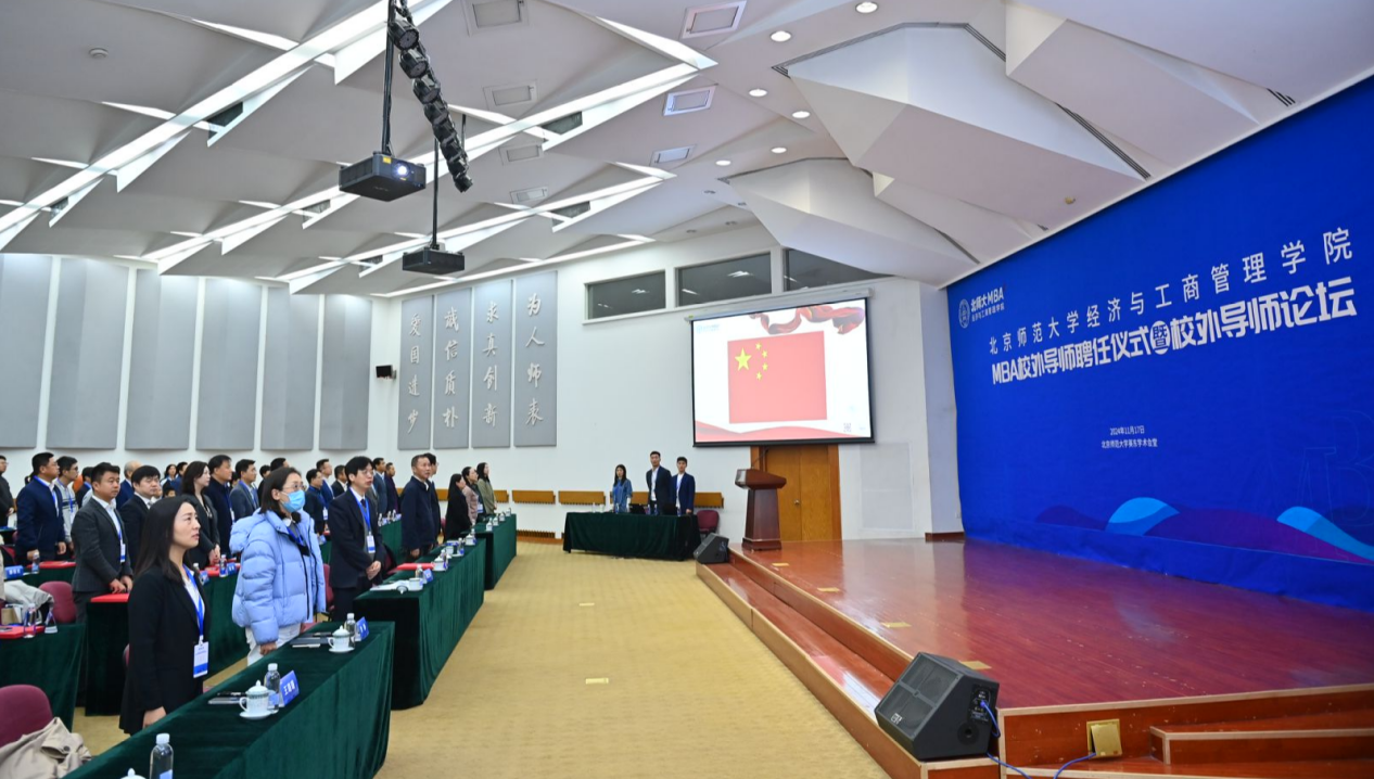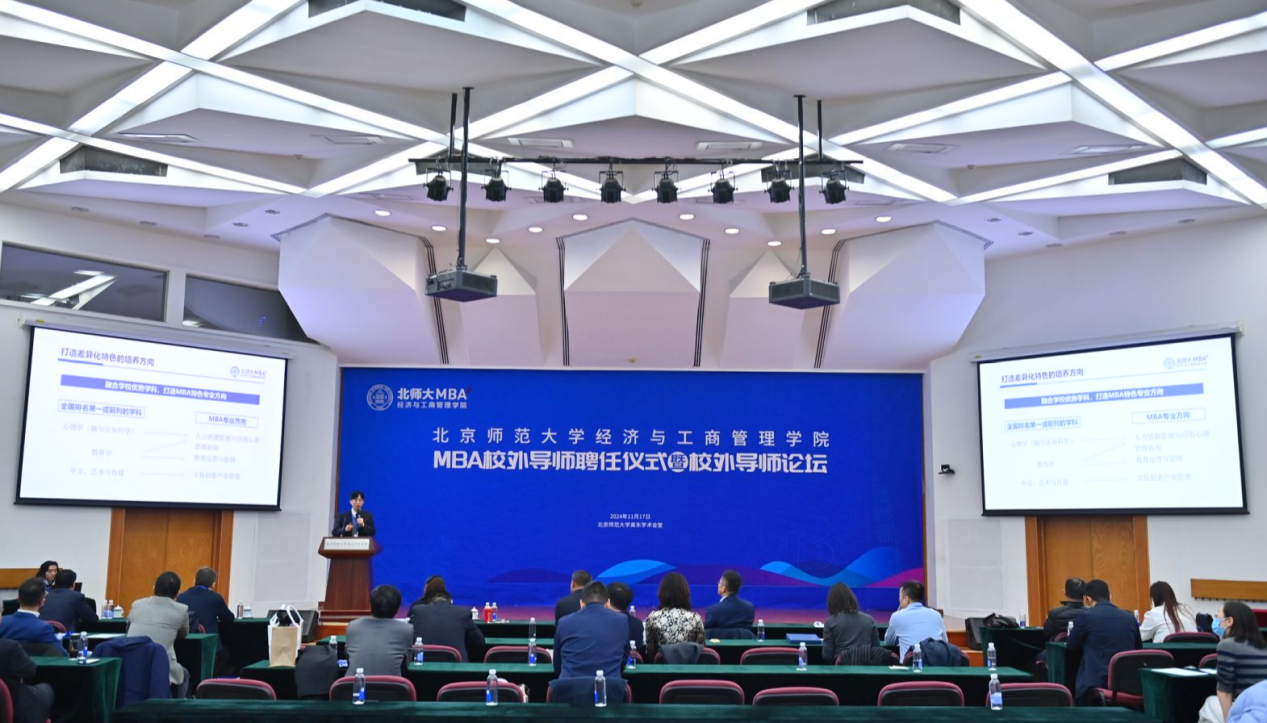 北师大2024级学生李雪峰作为学生代表发言,他认为校外导师对于学生提升实务操作能力、桥接理论与实践的鸿沟、增强实践认知以及深刻洞察企业运营和行业发展至关重要。李雪峰分享了个人职业转变的经历,强调了导师的一句话可能对学生产生深远影响,他的经历体现了导师在职业发展中的指导作用。他向在座的校外导师们致敬,认为他们的专业成就、实践经验和人生智慧对学生是一种宝贵的资源。李雪峰还感谢学院领导和MBA中心老师的精心组织,使得学生能与优秀的校外导师交流学习,并以“包容、多元、创新、责任”的价值观,激励同学们在北师大的平台上不断进步,共同塑造中国的新商业文明。
