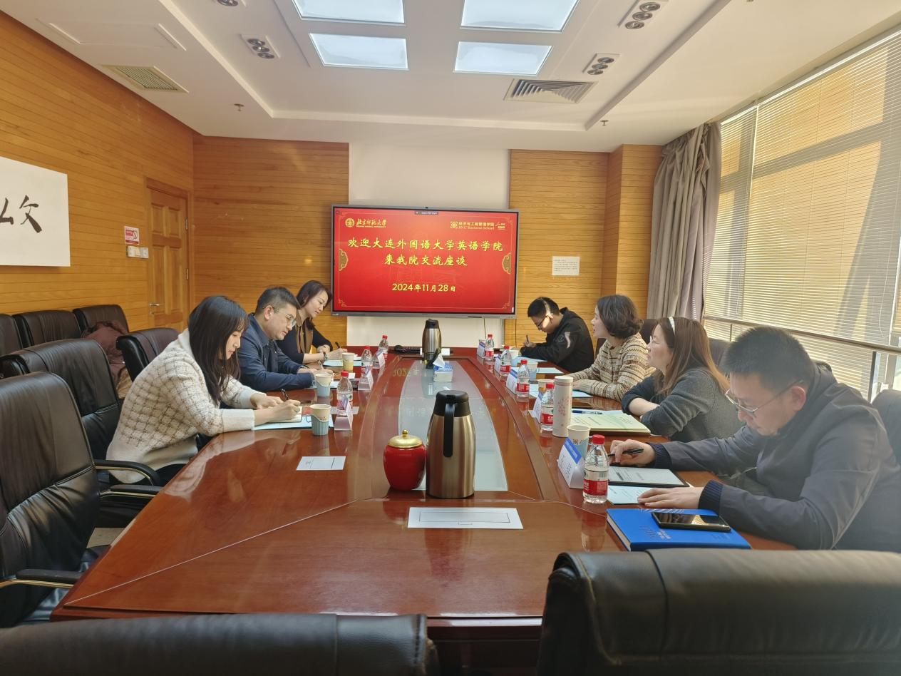 2024年11月28日下午,大连外国语大学英语学院党委书记兼副院长梁若冰、商务英语专业主任于红霞、研究生党支部书记黄新智一行3人来御宅屋 进行调研交流。学院党委副书记、副院长江婕、数字经济与管理系副主任童琼璐、办公室主任王玮、党委组织员王骏、经济与资源管理研究生党支部书记鲁煜晨参加了此次调研座谈会。