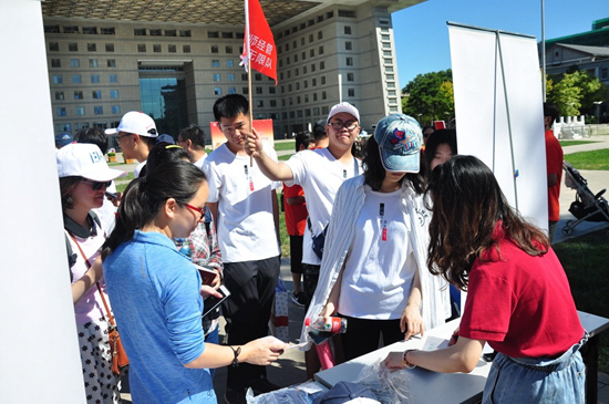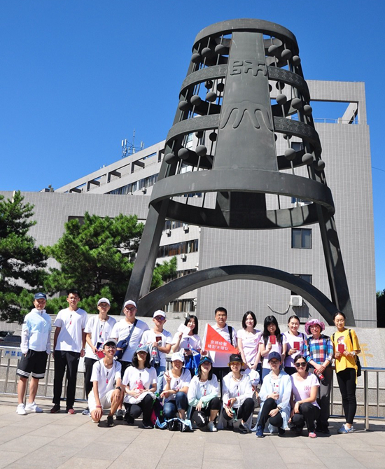 大家行走15圈后,在校友护照盖章后,又分别行至邱季端北门、教九小花园和木铎等有着北师大特色的景点进行盖章。最后集齐四枚印章的校友相伴在木铎处领取纪念品,并在木铎下拍照留念。