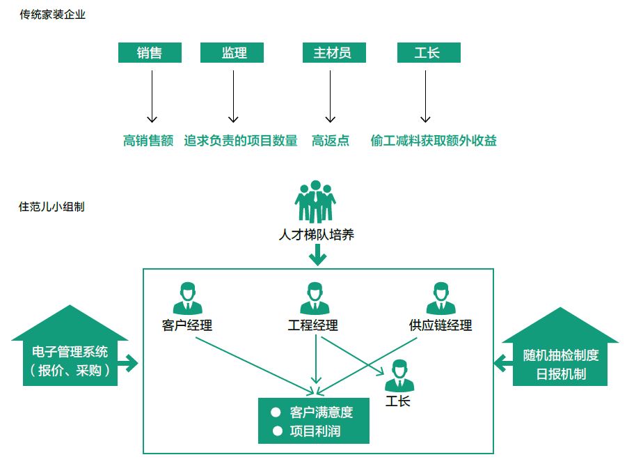 各部门目标不一致是症结所在。传统上,家装企业一般分为业务部(或者是销售部、设计部)、工程部、质检部与材料部四大职能部门。业务部只以签单为目标,缺乏签单后与客户互动的动力;工程部管理施工人员,由于追求内部和谐及利益,往往存在偷工减料等问题;质检部扮演监理角色,但其收入与负责的项目数量有关,监督质量难以保证;材料部负责采购,关注返点大于质量。