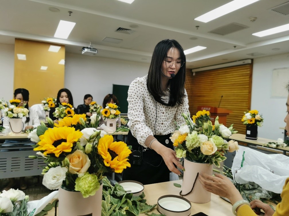本次活动由工会精心策划,请到了中国插花艺术博物馆花艺师管艳忍老师现场教学,从花枝裁剪到位置摆放,从色彩搭配到花叶点缀,教职工们在花艺老师的指导之下精心装点自己的作品,现场互动气氛热烈。