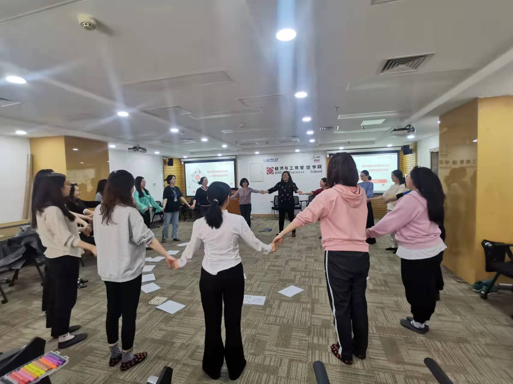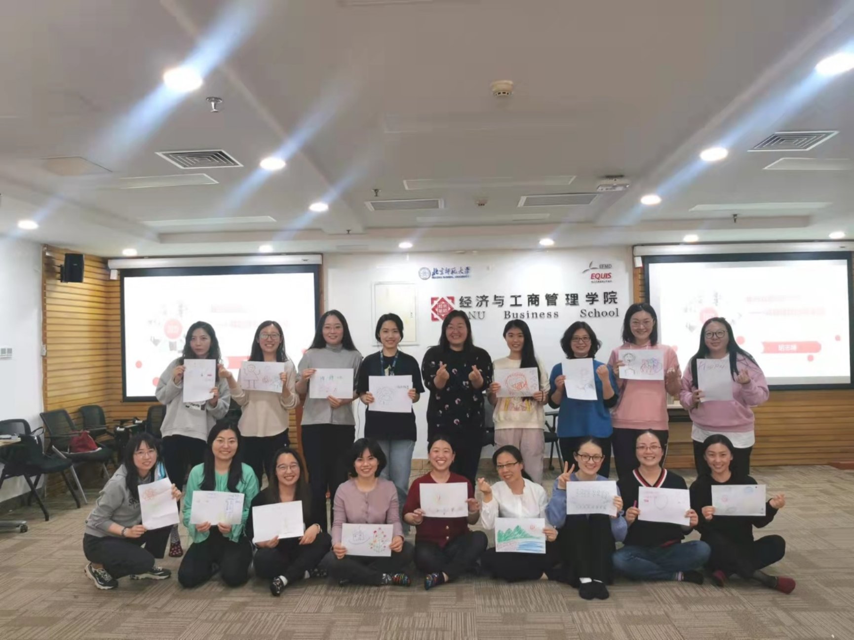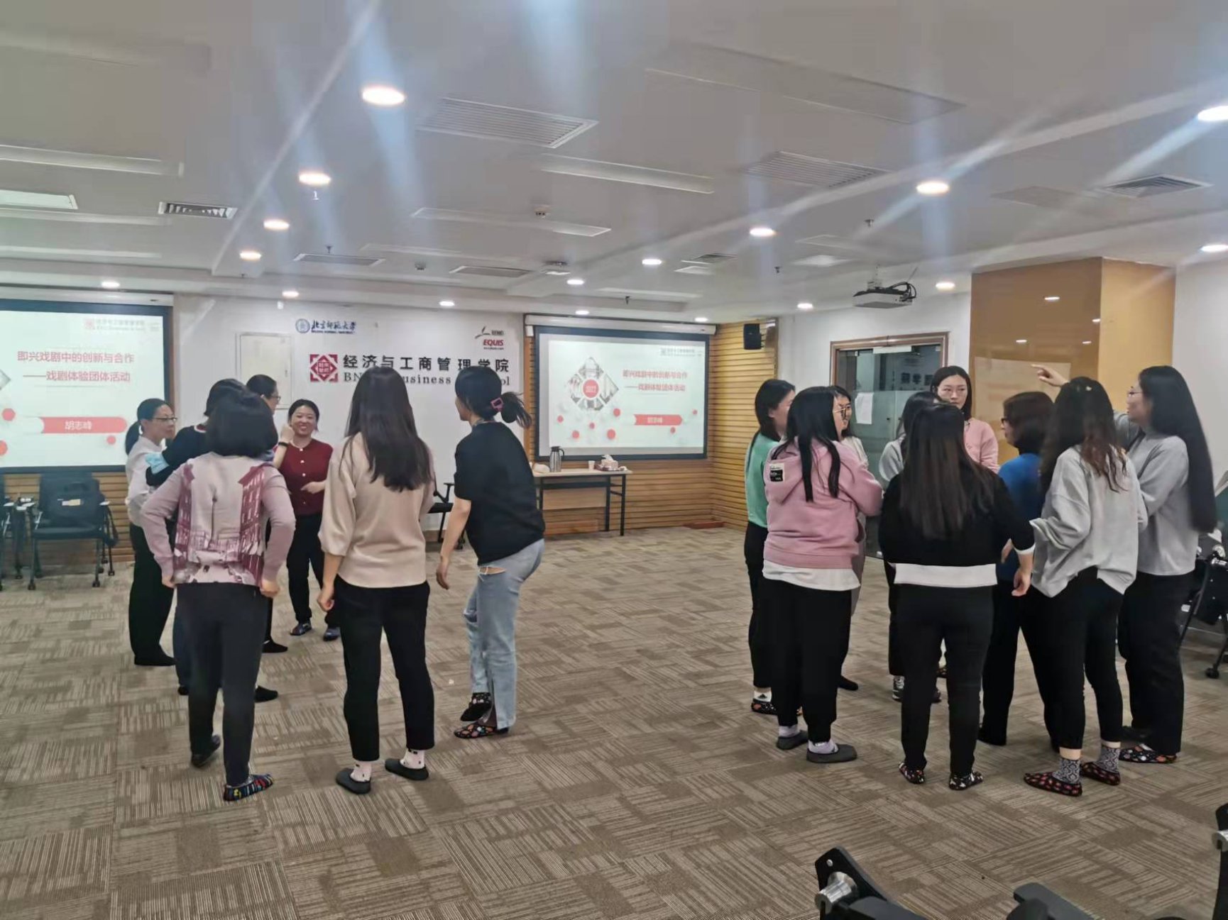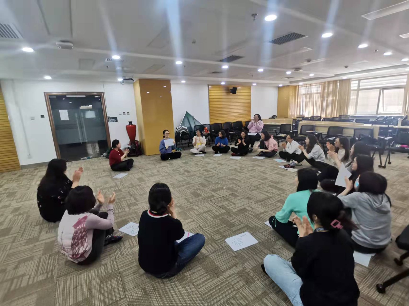 终于到了培训当天,怀着对主题的好奇和期待一进入9406,就看到了活力满满的胡志峰老师,一位将戏剧与心理治疗与疏导相结合的奇女子。在胡老师的带领下,我们通过“照镜子”(两两一组,相互模仿动作)的小游戏,活动开了我们那因久坐而早已僵硬的肩膀和腰腿,也甩掉了各种拘束。随后我们分为两组,通过随机情景设定,在三分钟内完成一个又一个简短的戏剧表演,平日严肃认真的同事们演绎了“太空漫步”、“沙漠寻宝”等一系列脑洞大开的剧情,展现了丰富的想象力,也在过程中加深了我们的协作意识与能力。活动的最后,当我们就像小时候那般围坐在地,分享自己的心情,为自己的心灵进行了一次疗愈。在我即将调岗、离开经管院前,感谢能有机会参与这个活动,并且通过分享向大家说出自己的心里话。我是幸运的,能加入经管院这样一个亲如一家的大集体,也感谢学院为我们行政岗位员工举办的各类培训活动,拓宽了我们的视野,疗愈了我们的内心。经管院,遇见你,三生有幸!