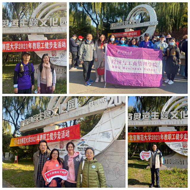 本次活动,不限起终点和配速,老师们自选路线,完成5公里即可。校工会在奥森南园健步途中设立两个打卡站,布置校旗等,为健走友们加油鼓劲。在"廉洁奥运主题文化园"雕塑前照了合影后,活动正式开始,老师们精神抖擞,兴致高昂,沿着步行道阔步向前,一边呼吸着新鲜的空气,一边进行着生活和工作方面的交流,感受着集体活动带来的愉悦。和谐的倩影与公园入秋后的美景相得益彰,蓝天、白云、健步打卡的队伍共同构成公园里亮丽的风景。